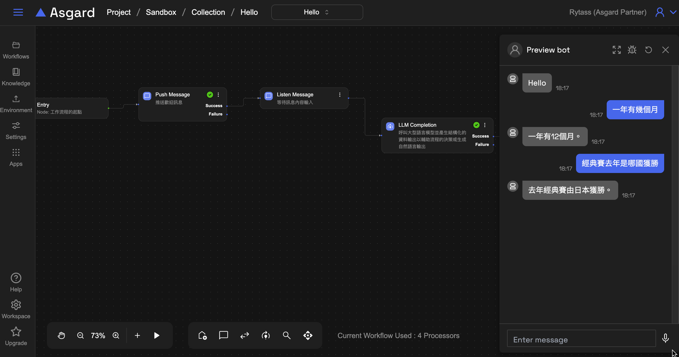 | Bot: hello! | User: 一年有幾個月 | Bot: 一年有12… | User: 經典賽... | Bot: 日本 |