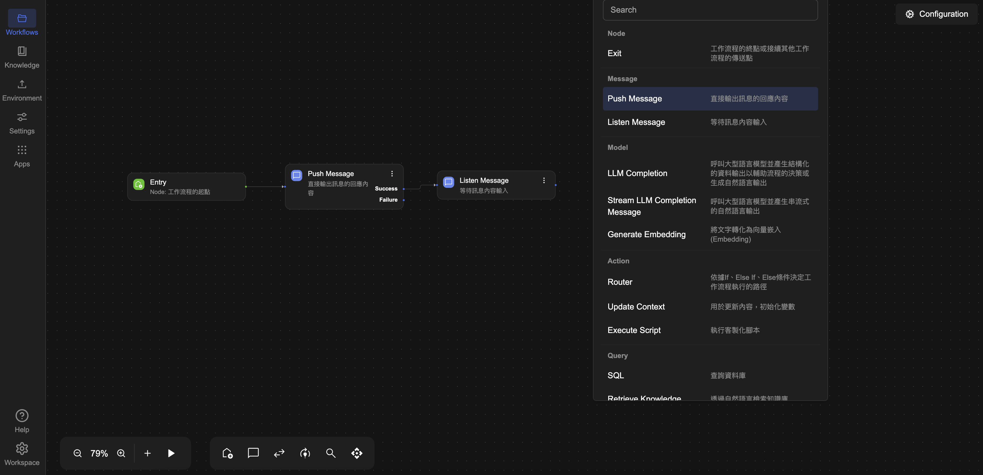 點選畫面左下方的 + Add Processor 按鈕,從節點清單中選擇 Listen Message。新增後,Listen Message 節點方塊將出現在工作流程編輯畫面中,串接於 Push Message 的 Success 之後。