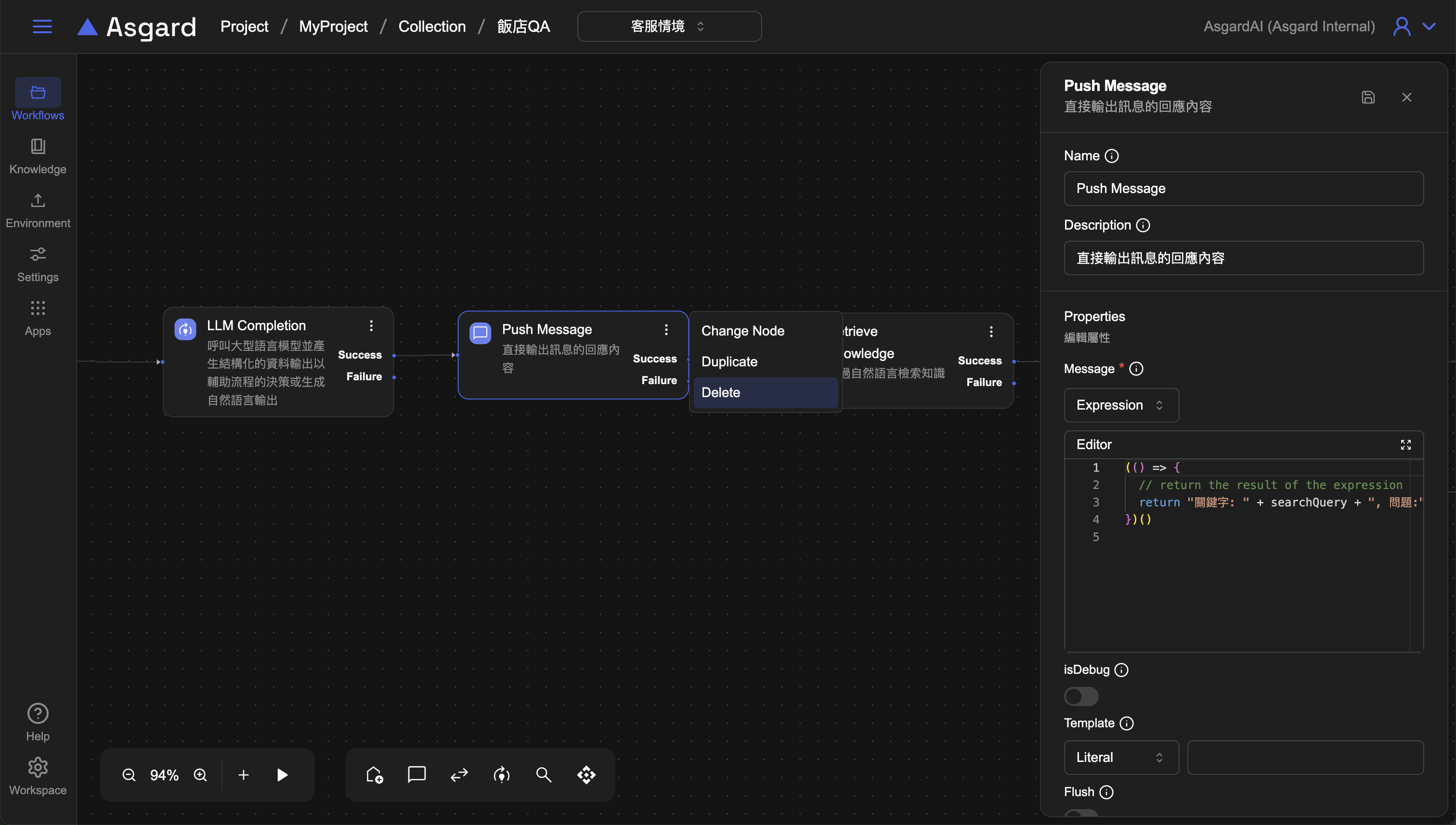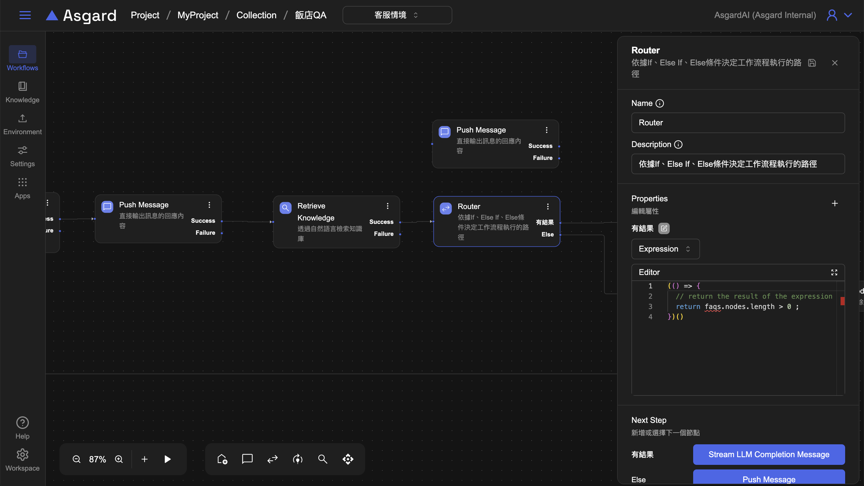 刪除上一章節第五步的 Push Message 並加上 Router 來判斷是否有 Retrieve Knowledge 的結果。
