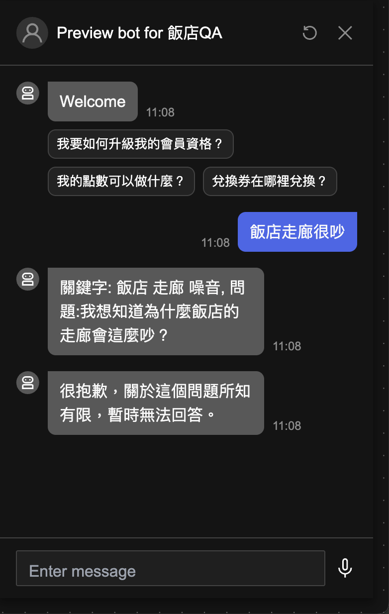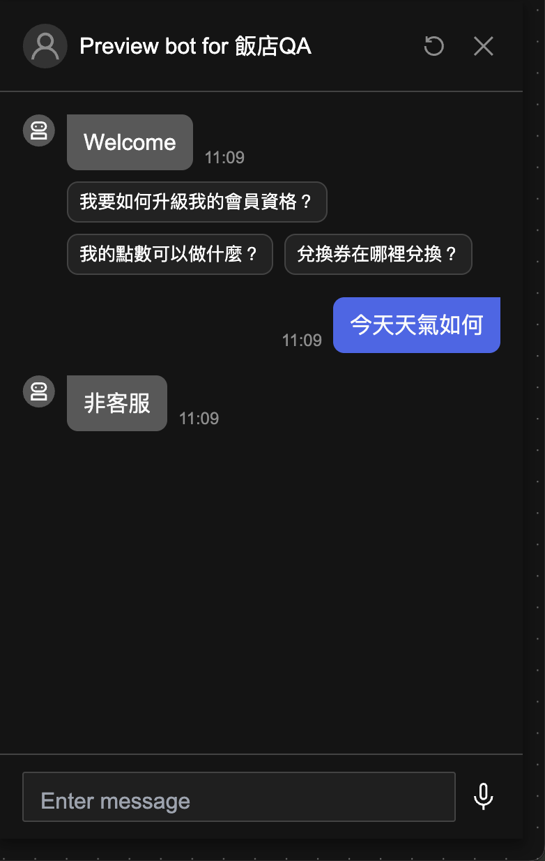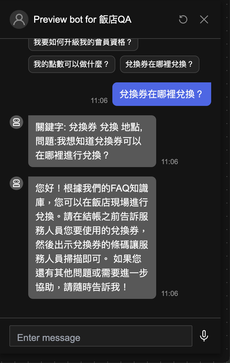 至此我們將客服 AI 做了更完善的改良,客服 AI 除了能判斷是否為客服情境之外,還能搜尋知識庫內的知識做出自然語言的回應。點擊 Preview 來預覽並測試以下情境:
