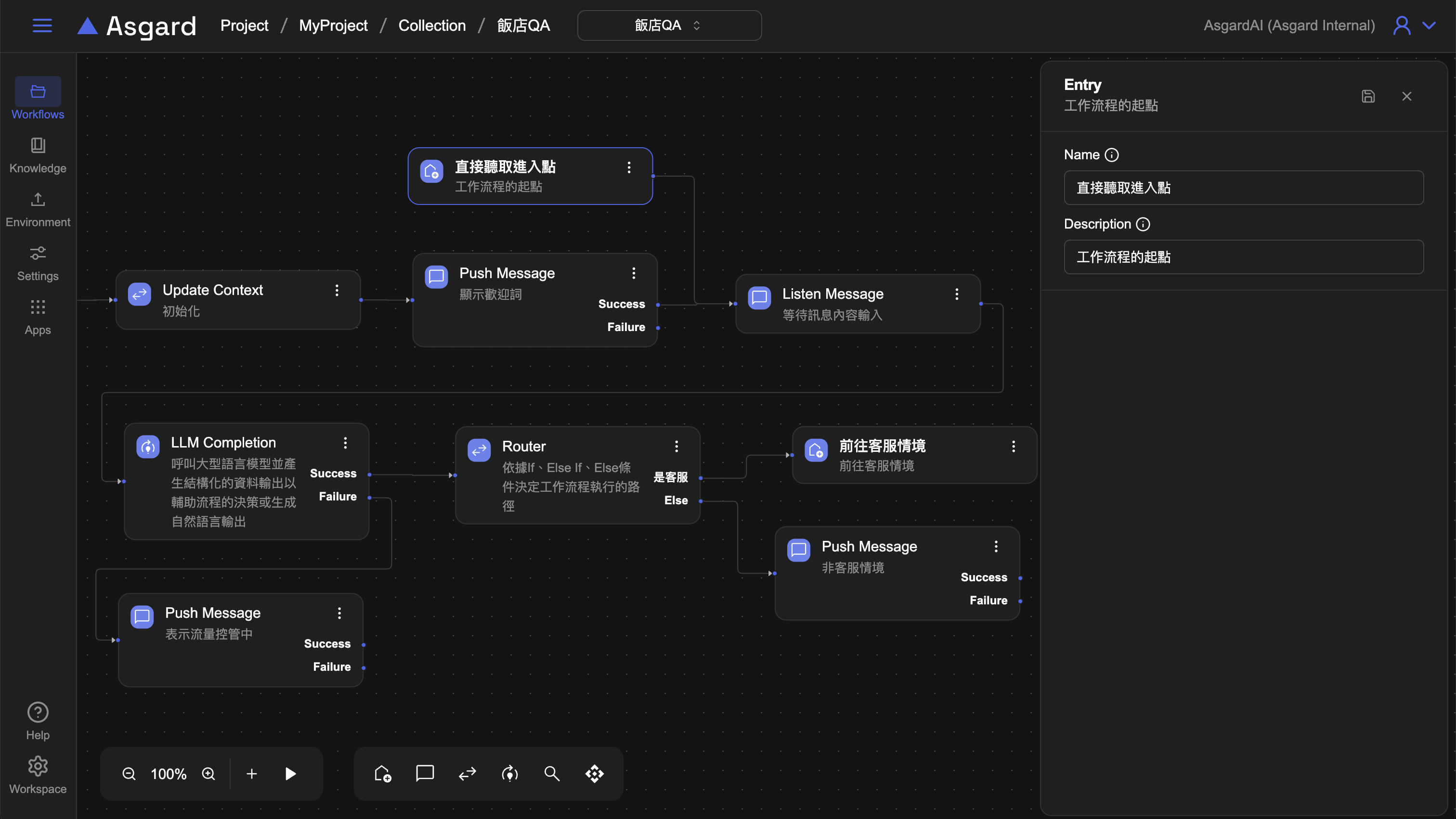 回到飯店 QA 的 Workflow 並新增一個進入點,可直接點擊上方的飯店 QA 回到 Workflow Sets 選取或是使用頂端列的選單切換,新增後修改名稱與描述為「直接聽取進入點」,並將該節點連接到 Listen Message。