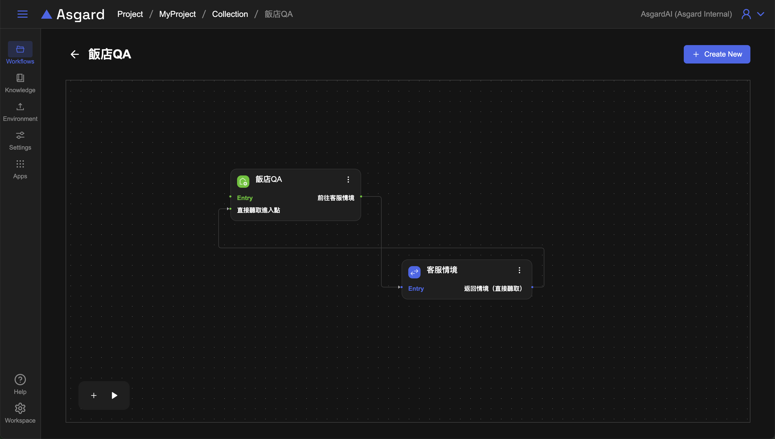 點擊上方「飯店QA」名稱返回Collection可以看到剛剛分別在飯店QA與客服情境裡新增的Exit與Entry,將 Exit 與 Entry 連接便完成了 AI 找不到回答的流程處理,並能將用戶導向到先前設計的 Listen Message 去聆聽用戶問題並判斷是否為客服情境。