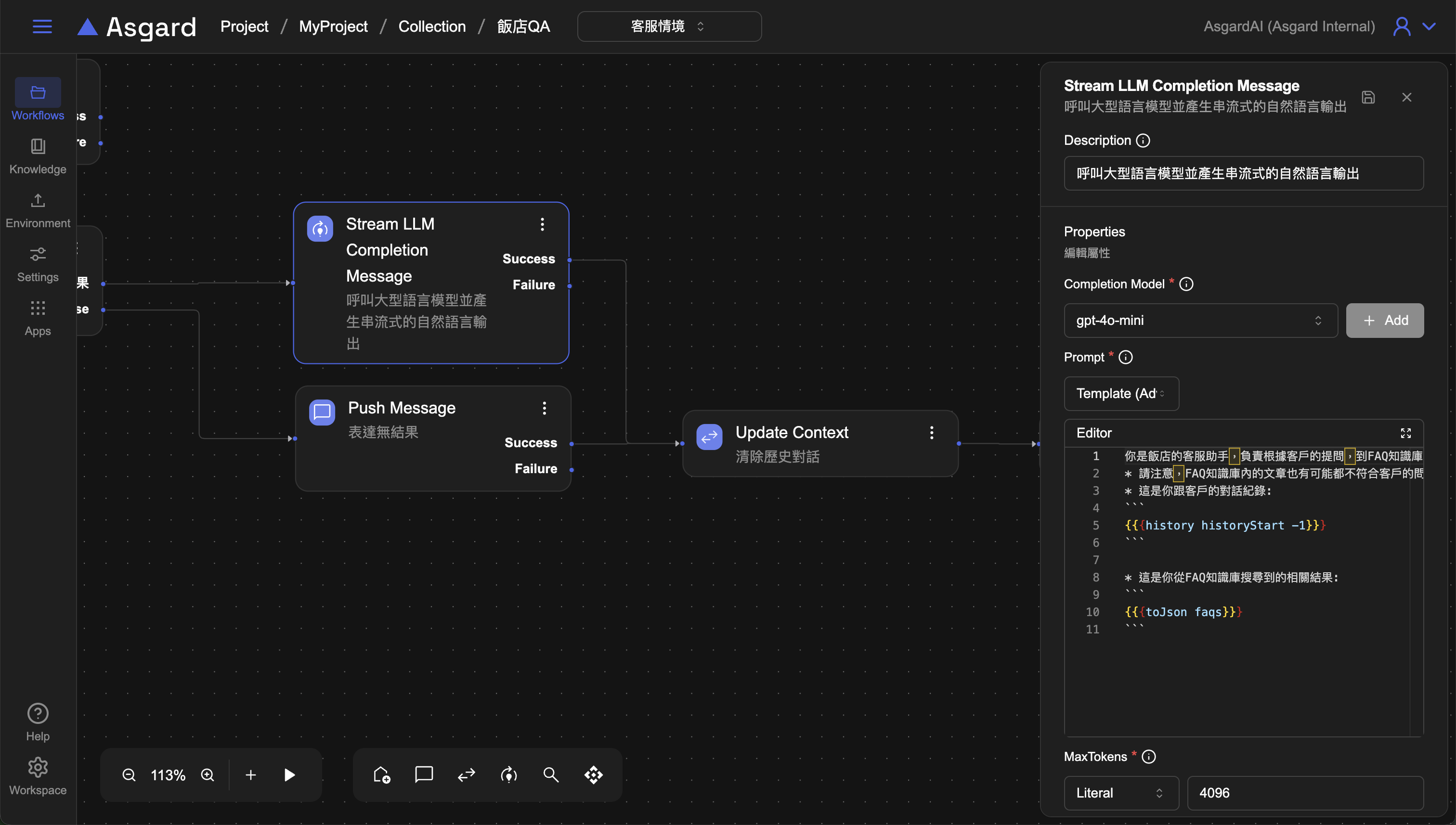 historySize為 Asgard 內建函數,historyStart 為先前在 Update Context 裡所新增的變數,historySize 是指訊息的總量,每一則訊息都 會記算一筆,算到上一個對話為止,因此這裡是將 historyStart 更新為 historySize,讓 AI 從新一輪的對話開始。