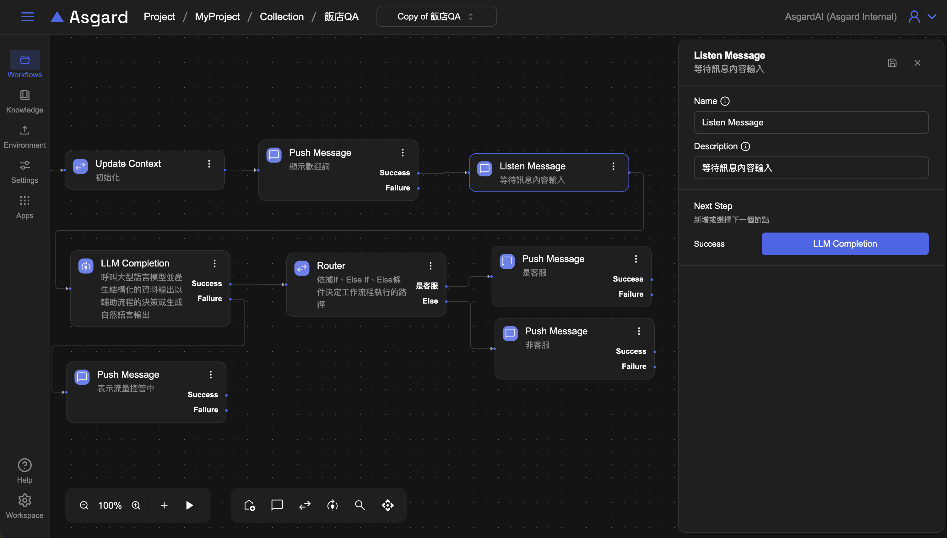 history為 Asgard 內建函數,historyStart 為步驟 2 時在 Update Context 裡所新增的變數,-1 是指算到上一個對話為止,因此這裡是在告訴 LLM 用戶的歷史對話紀錄是從 historyStart 到上一個對話,也就是步驟 4 的 Listen Message 用戶輸入的問題。