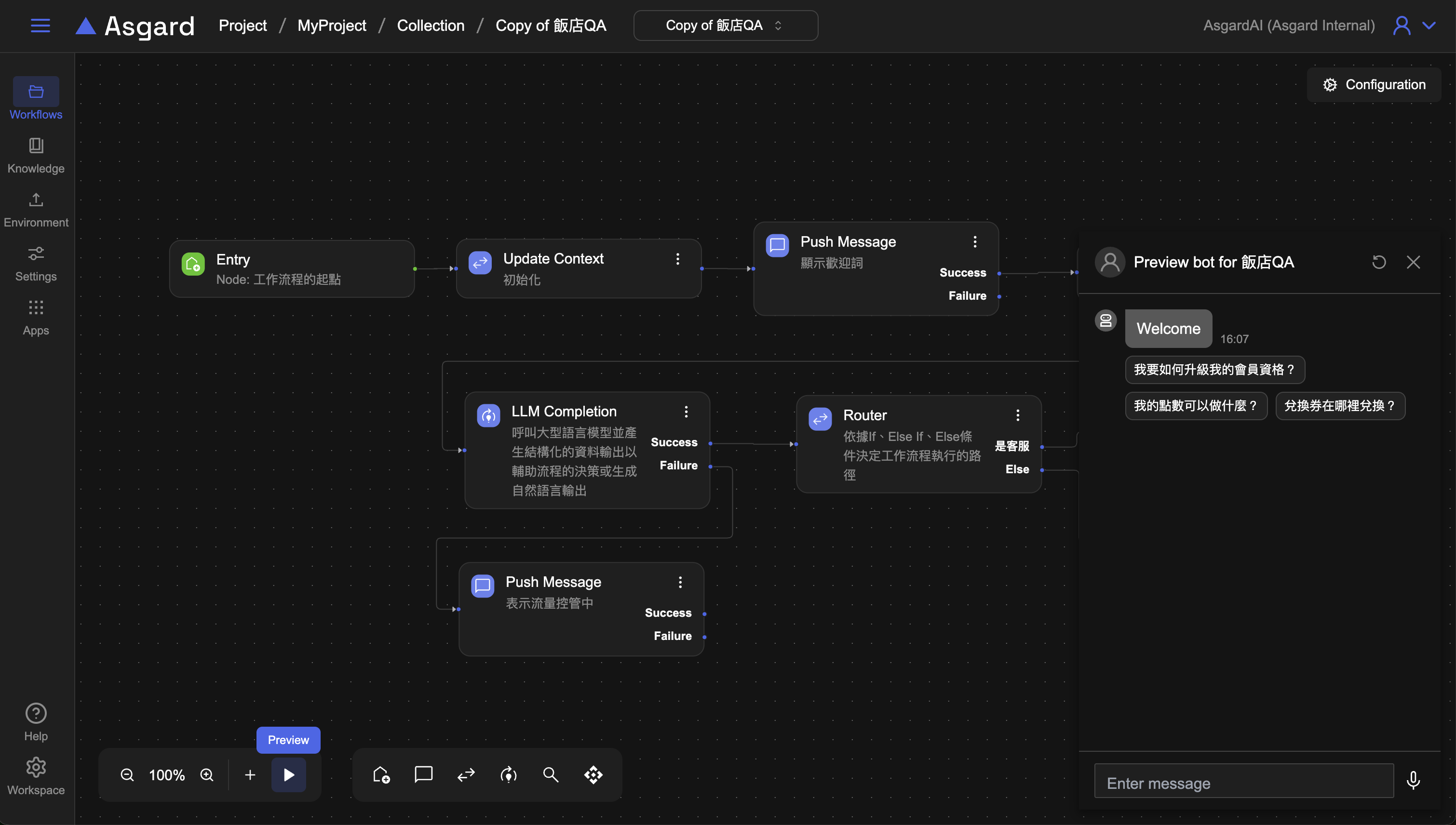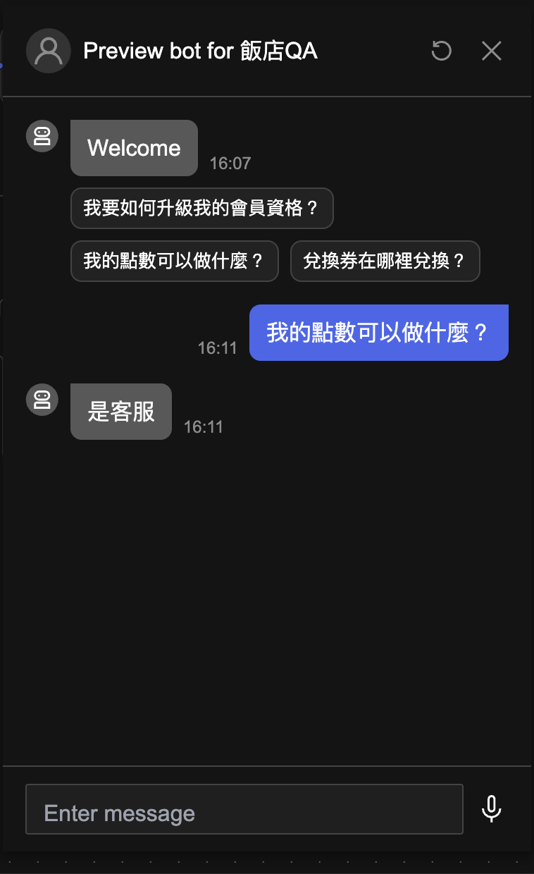 點擊 Preview 來預覽剛剛編排好的工作流程,若執行成功應可順利看到以下飯店 QA 的 Bot。接著就可以測試 AI 是否能 正常判斷用戶的問題為客服問題或非客服問題。