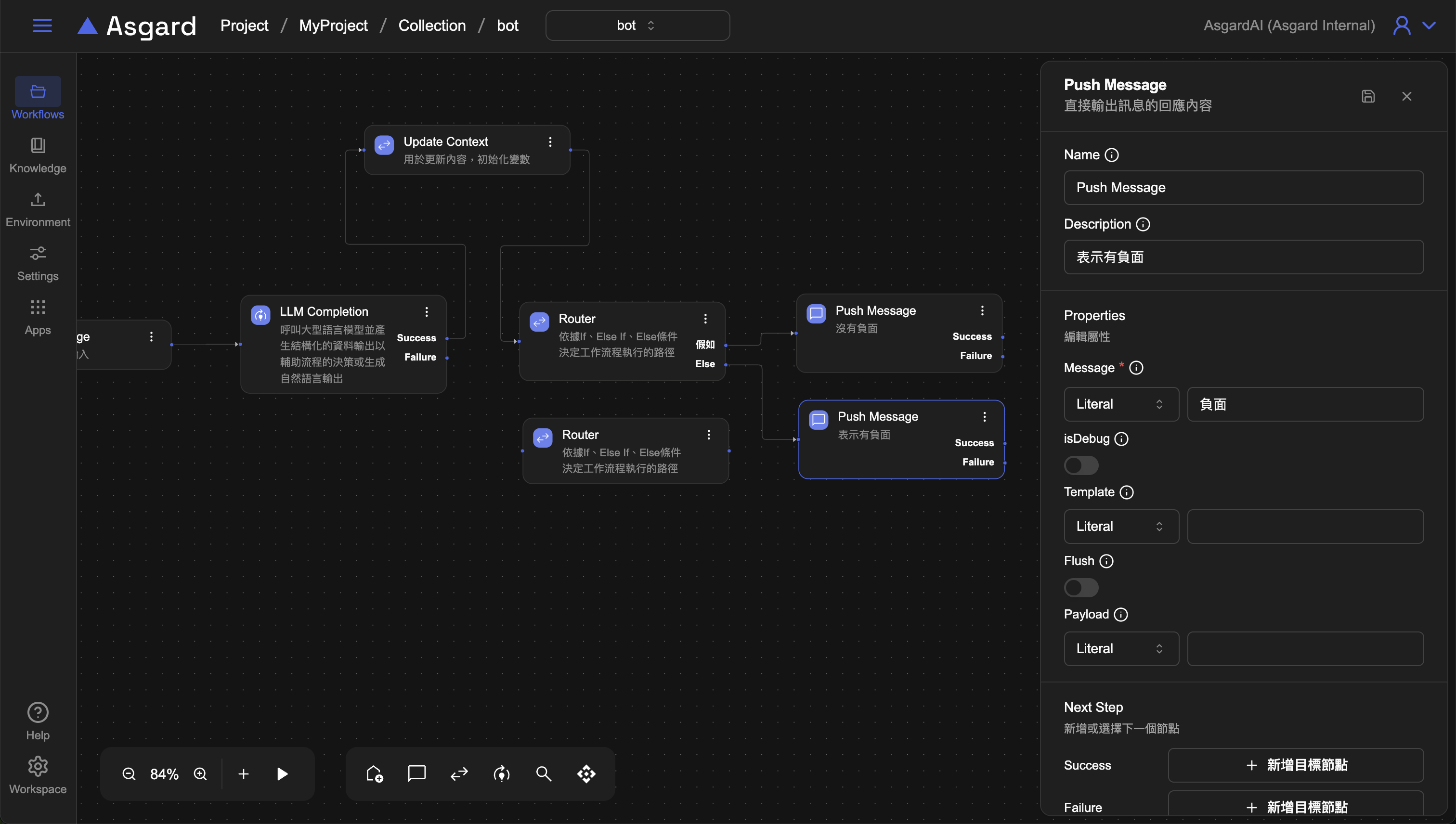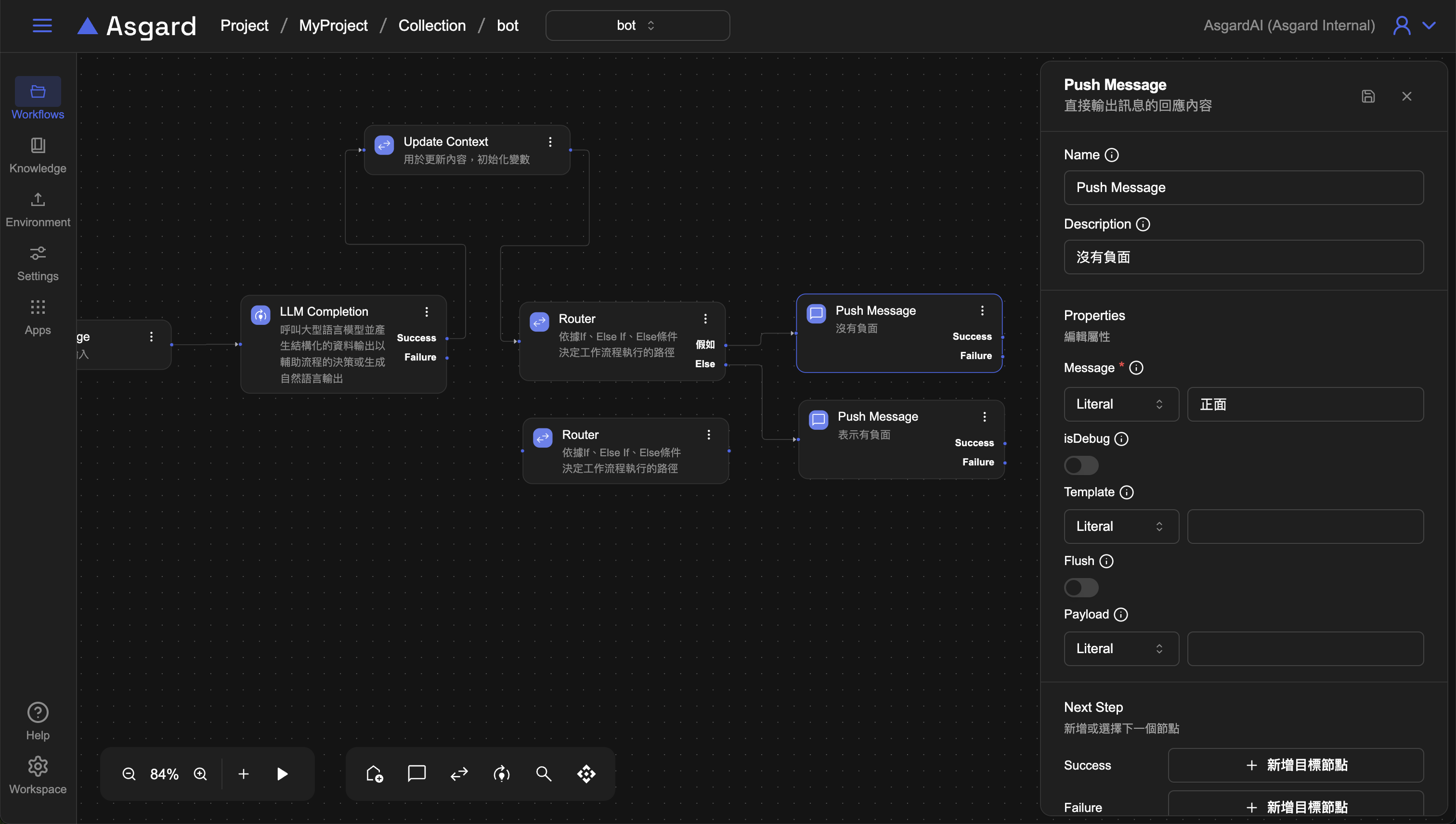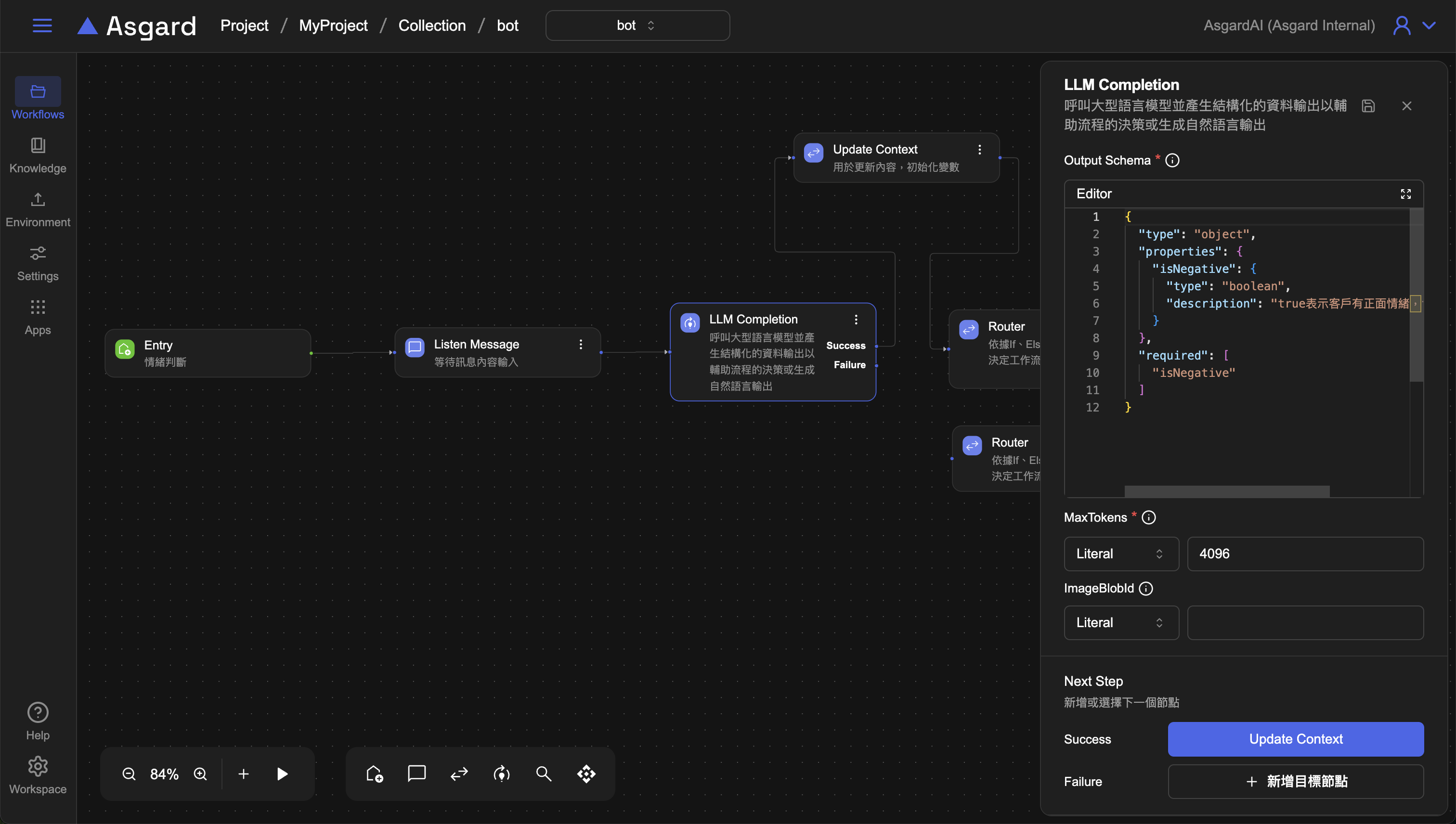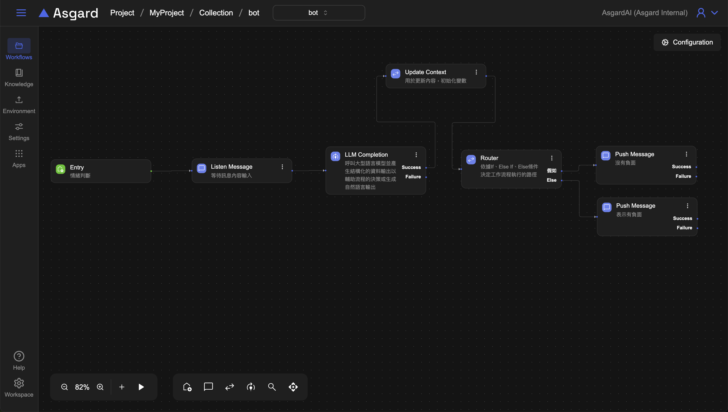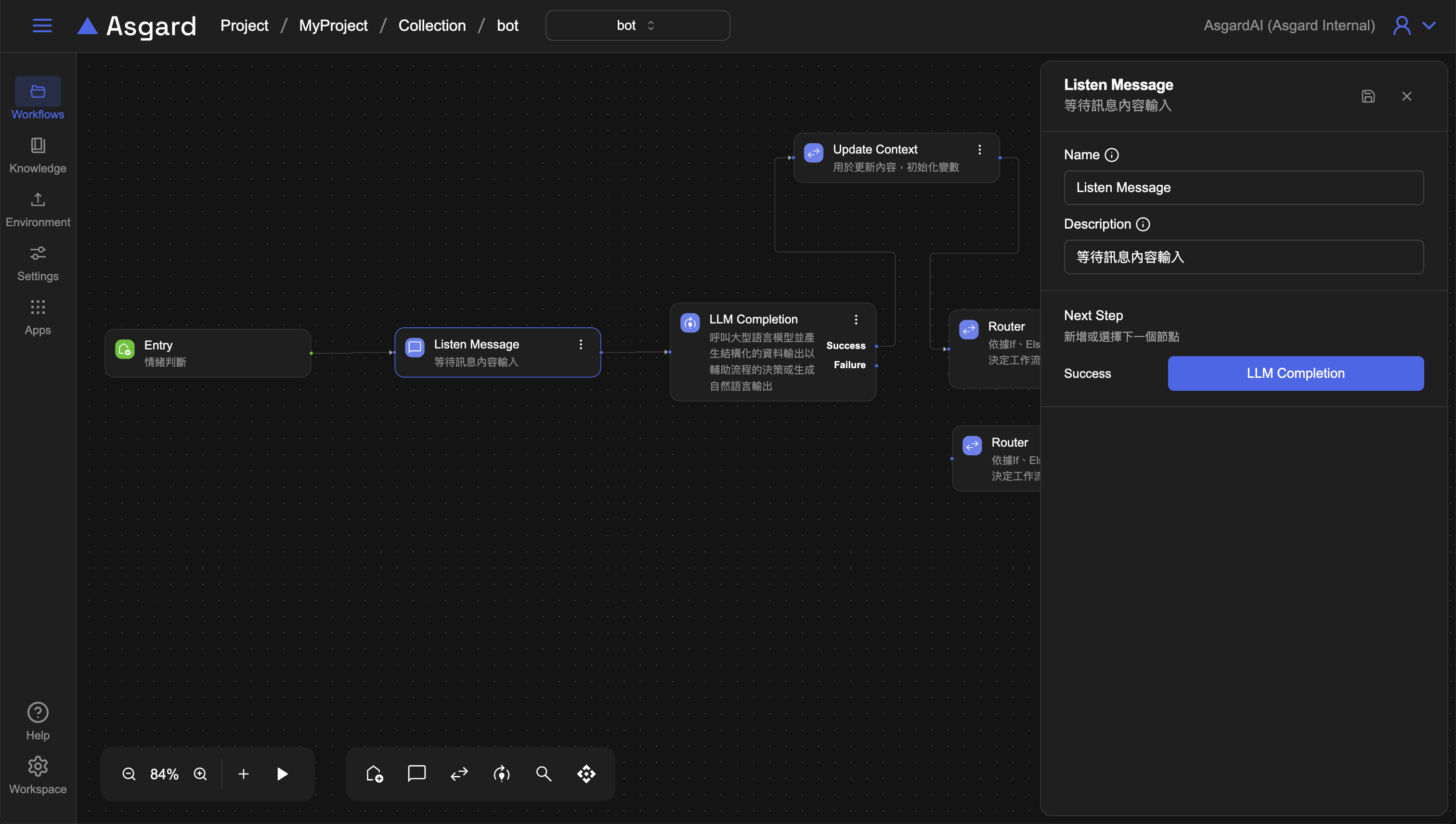 history為 Asgard 內建函數,0 是指第一則訊息,-1 是指算到上一個對話為止,因此這裡是在告訴 LLM 用戶的歷對話紀錄是從第一則到上一個對話,也就是上一步的 Listen Message 裡用戶輸入的問題。