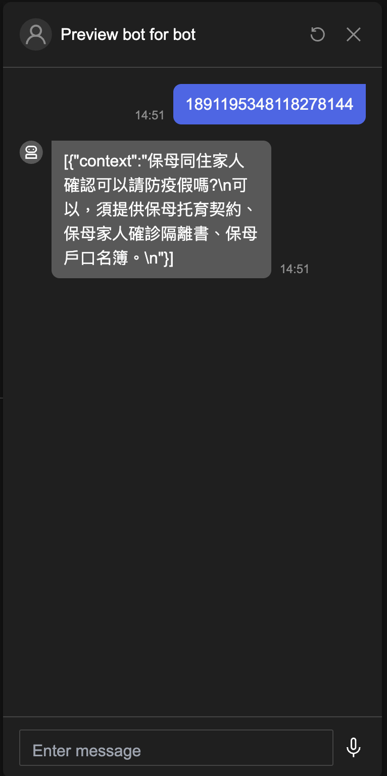 點擊Preview來預覽。直接在預覽視窗輸入id送出,AI會查詢資料庫並將查詢到對應的資料印出。