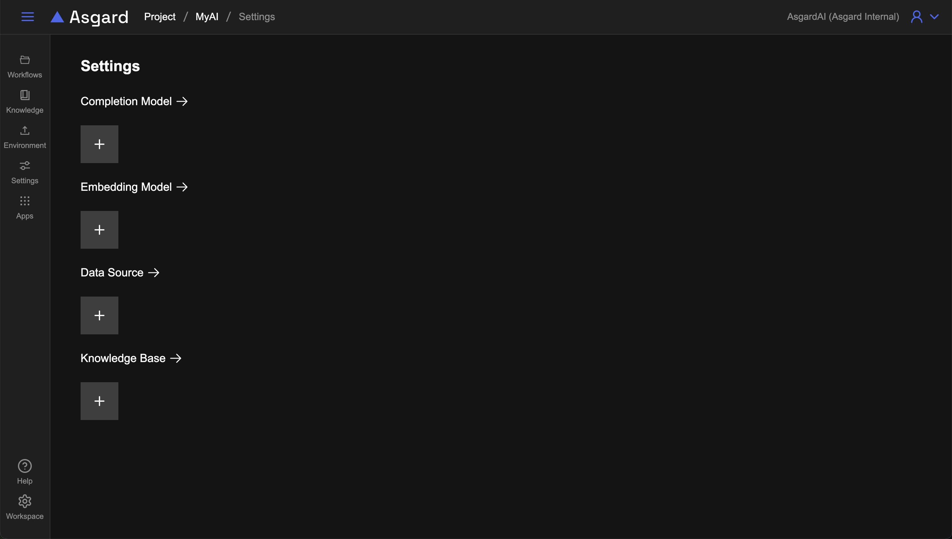 所有與 Project 相關的設定都可以在 Settings 內新增或瀏覽,包含 Completion Model, Embedding Model, Data Source, Knowledge Base。功能較多的 Knowledge Base 有額外獨立在功能列供快速存取。首次進入 Settings 可能會都是空的,點擊對應區 塊的「+」即可新增對應的設定。