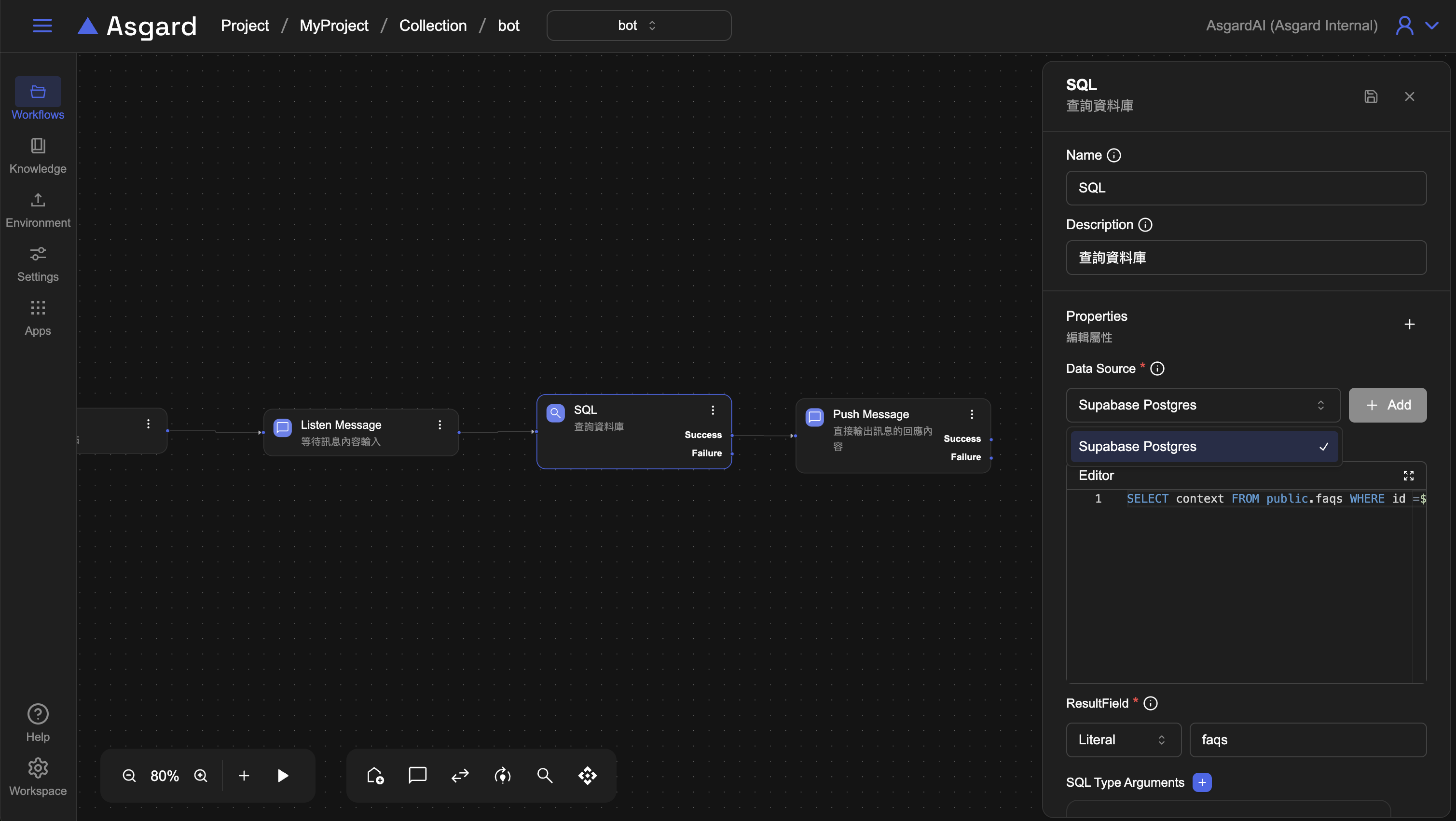 在 Project 內,可以點擊左側 Settings 並選擇新增資料來源,填入相關資訊後,即可在 Workflow 內使用下拉式選單選取資料來源。若沒有事先設定,則在 Workflow 新增 data source 時,會跳出新增資料來源的彈窗,設定後即可使用。