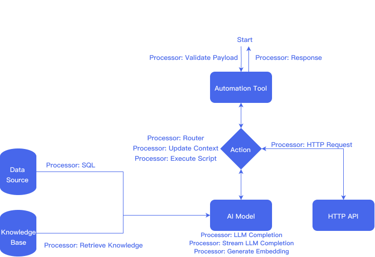 Automation Tool 與 Bot 的區別在於,Automation Tool 多了專屬的 processors: Validate PayloadResponse,讓用戶可以快速拖拉建立 API。新增 Automation Tool 時,Asgard 預設會為您建好初始進入節點與 Validate Payload 節點,節省建立時間。Validate Payload 用於驗證 input,Response 則是用來放 output 的結果。