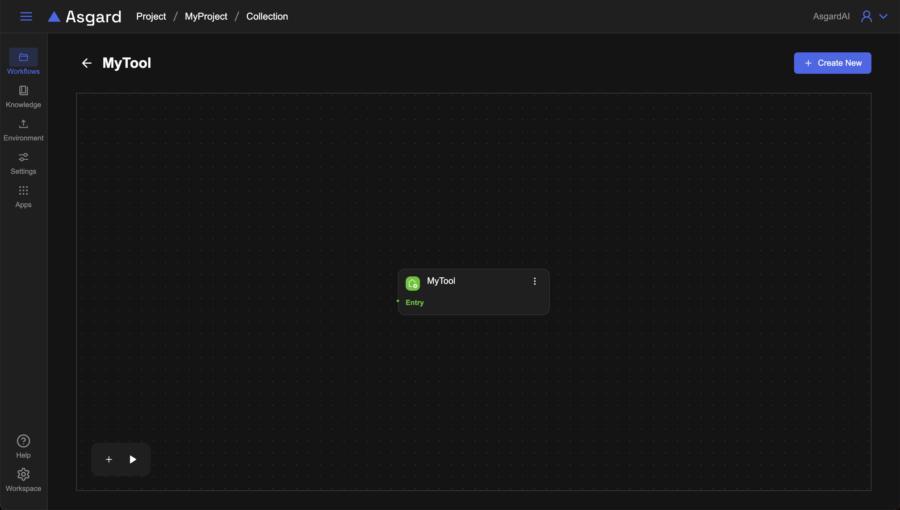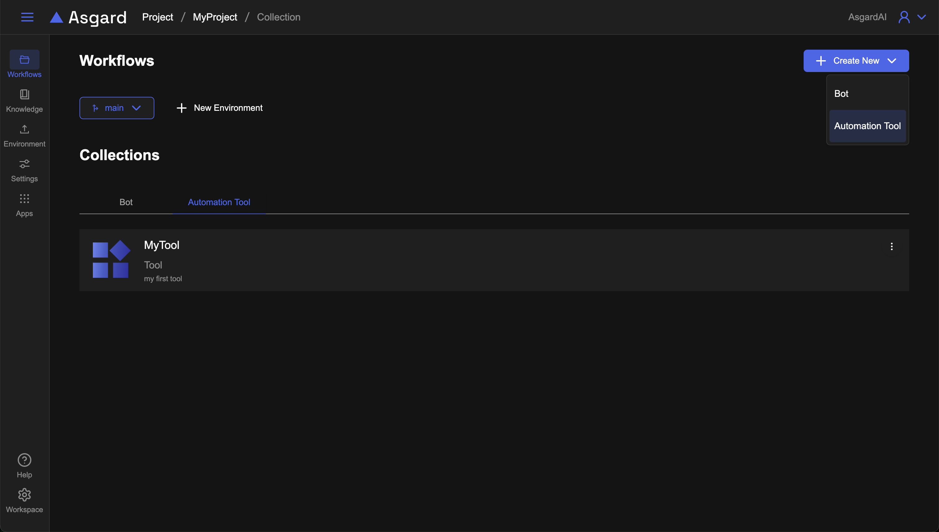選擇 Project 進到該 Project 的 Collections 頁面,點擊右上方「Create New」選擇 Automation Tool 類型建立,輸入名稱與描述建立後,可以在 Automation Tool 看到剛剛新建的 MyTool,點擊進入 workflow sets 頁面,可以看到 Asgard 已經預設幫您建好了初始的 workflow,點擊該 workflow 進入 workflow 工作區。
