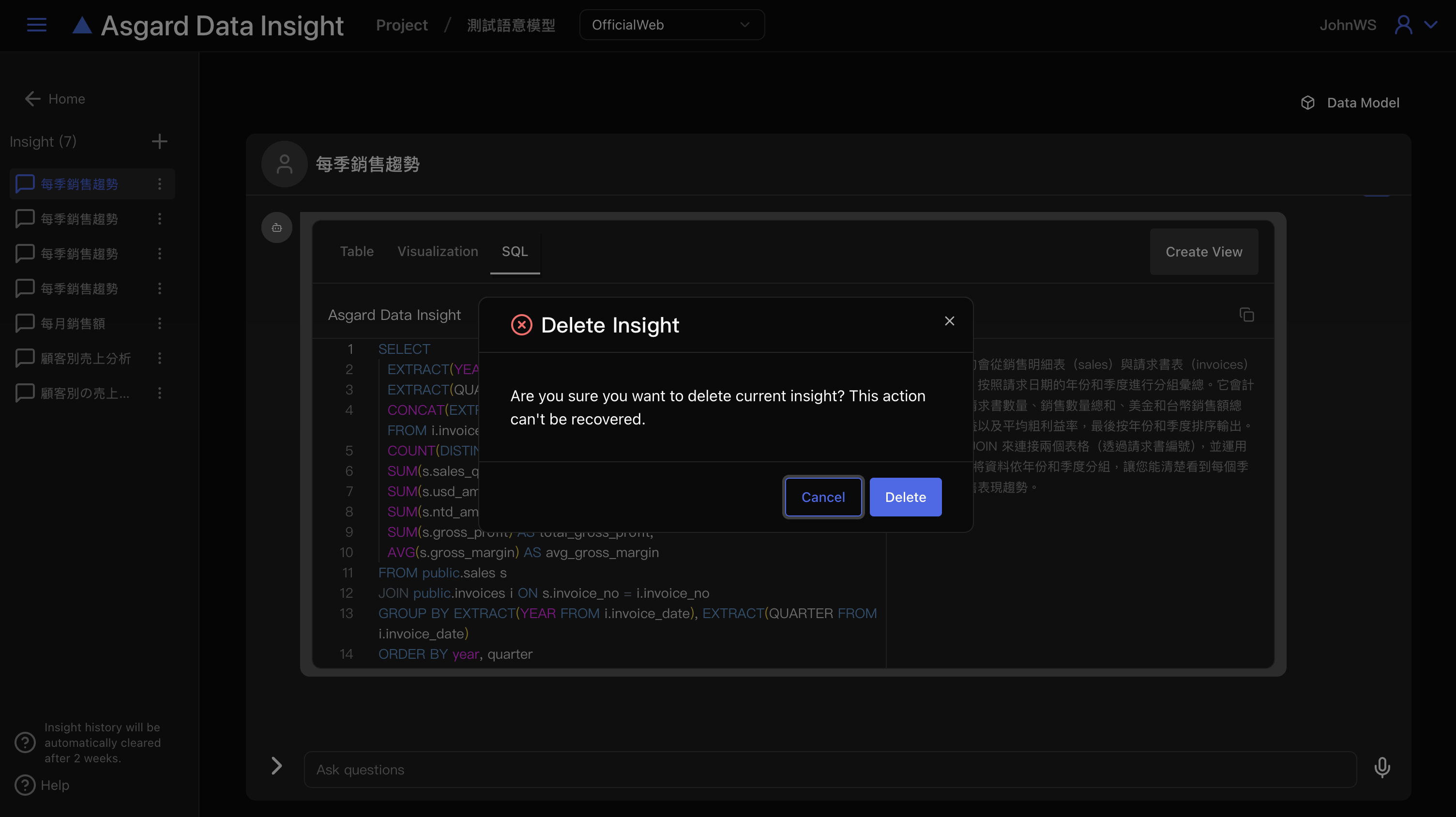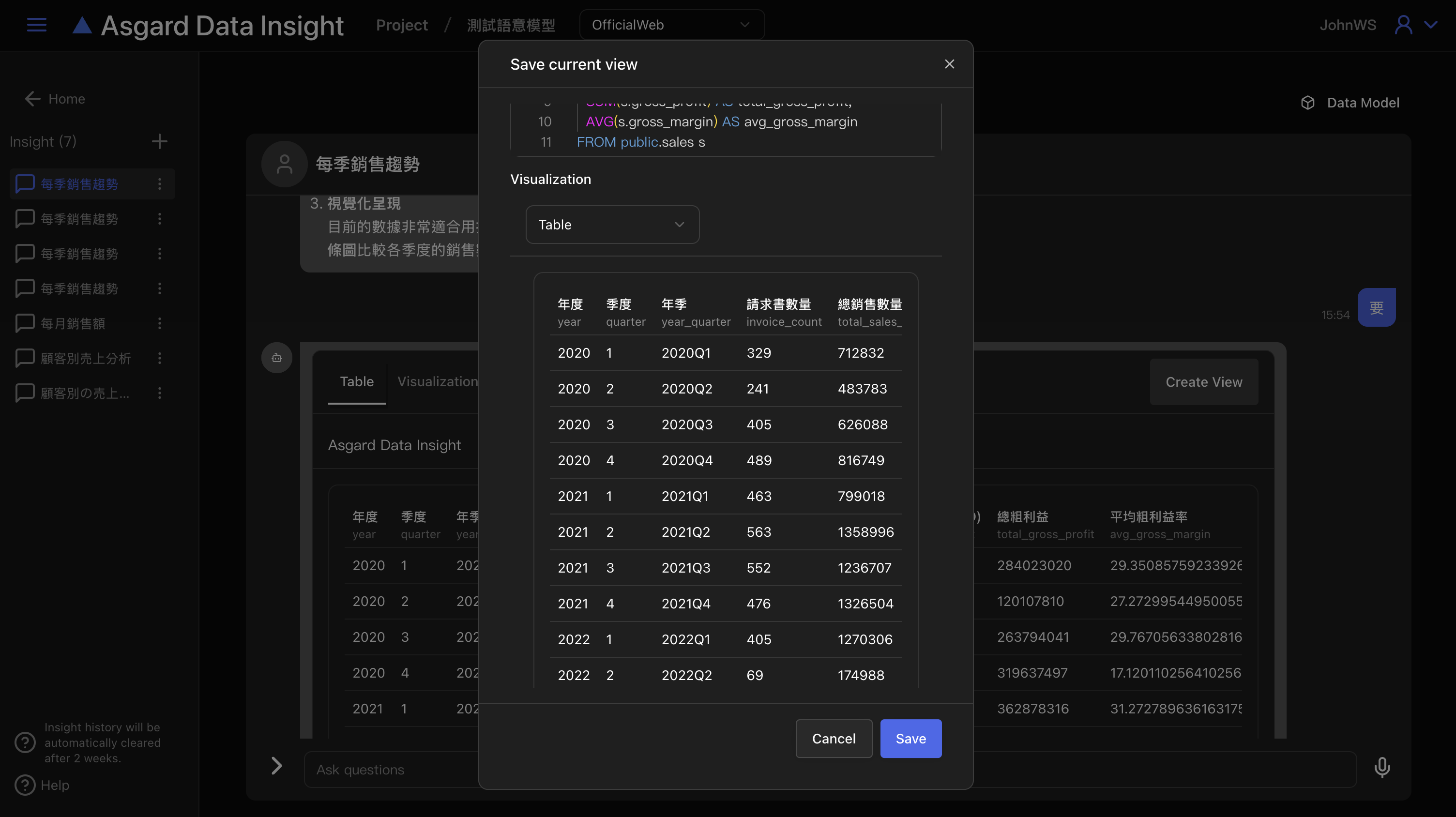 注意,Insight 僅會儲存兩週,超過兩週的 Insight 將會被系統自動清除,請務必將需要的 SQL 與 Visualization 儲存成圖表(Create View)。