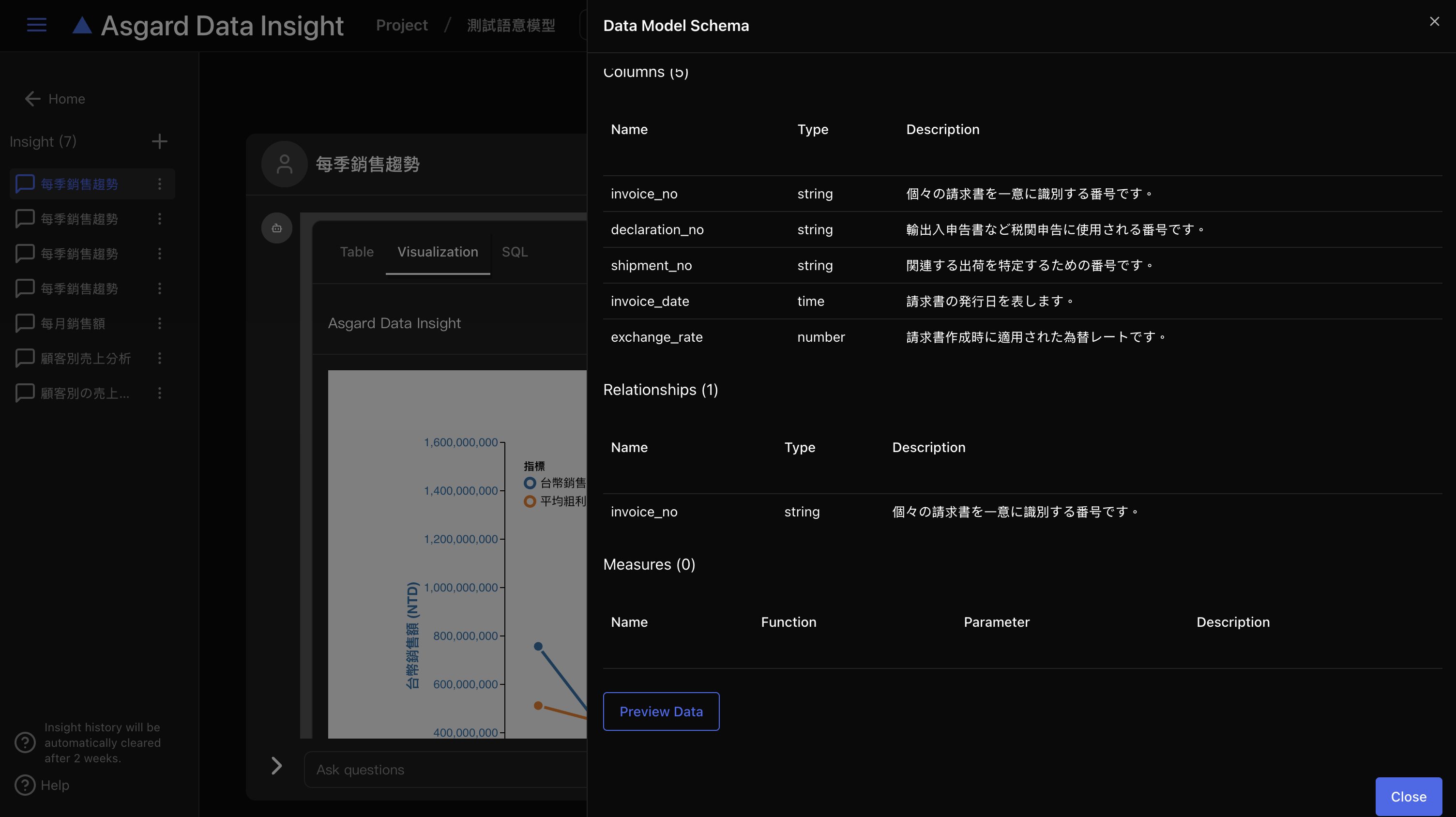 在使用 Insight 問答時,若需要檢視資料模型,可以點擊右上角的「Data Model」來檢視該資料模型的內容,可以在 Table 的選單選擇欲檢視的 Table 來檢視。底下可以點擊「Preview Data」來預覽資料。