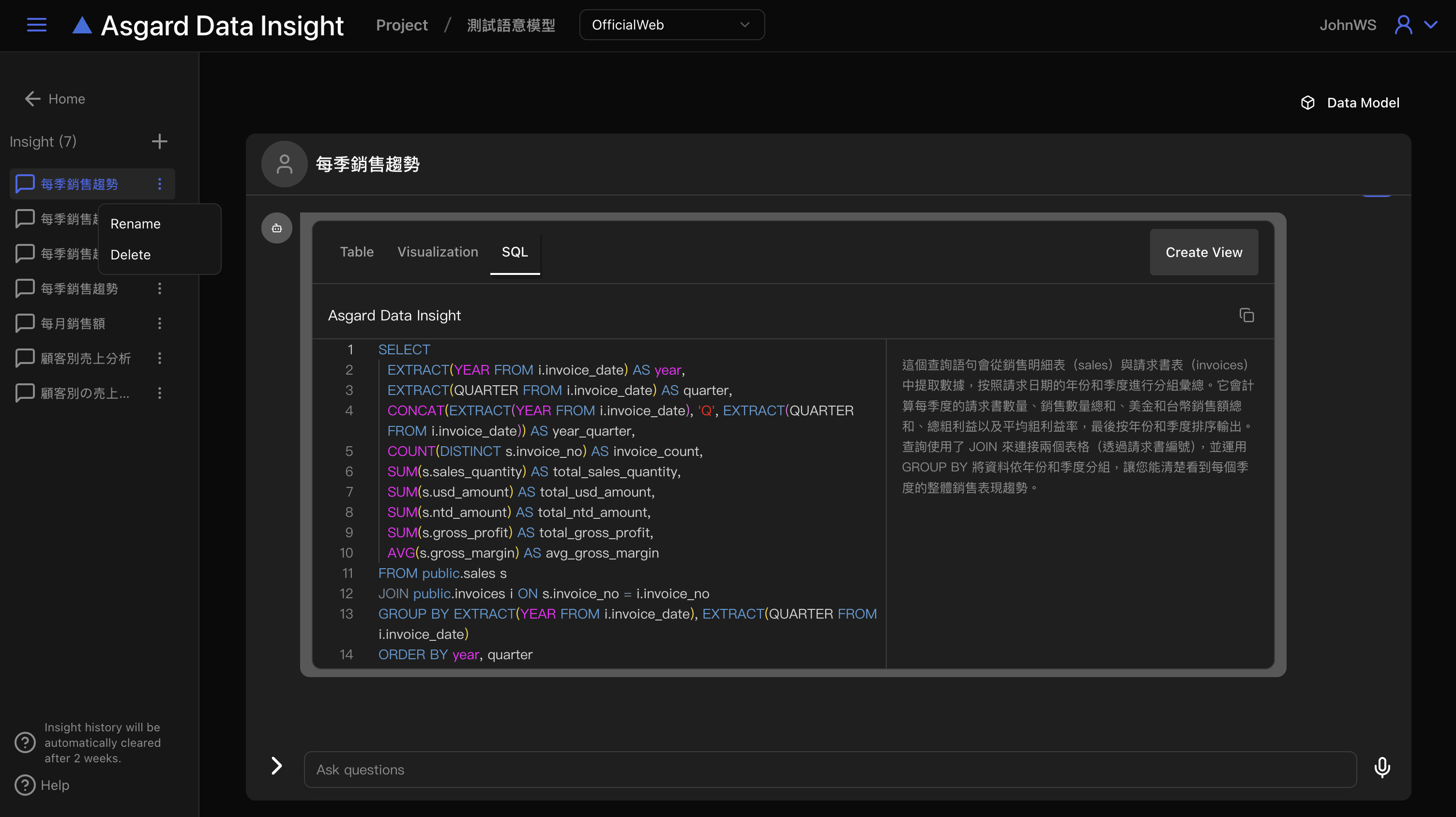 Asgard Data Insight 會自動開啟新的對話,請在底下對話框內輸入問題並送出。