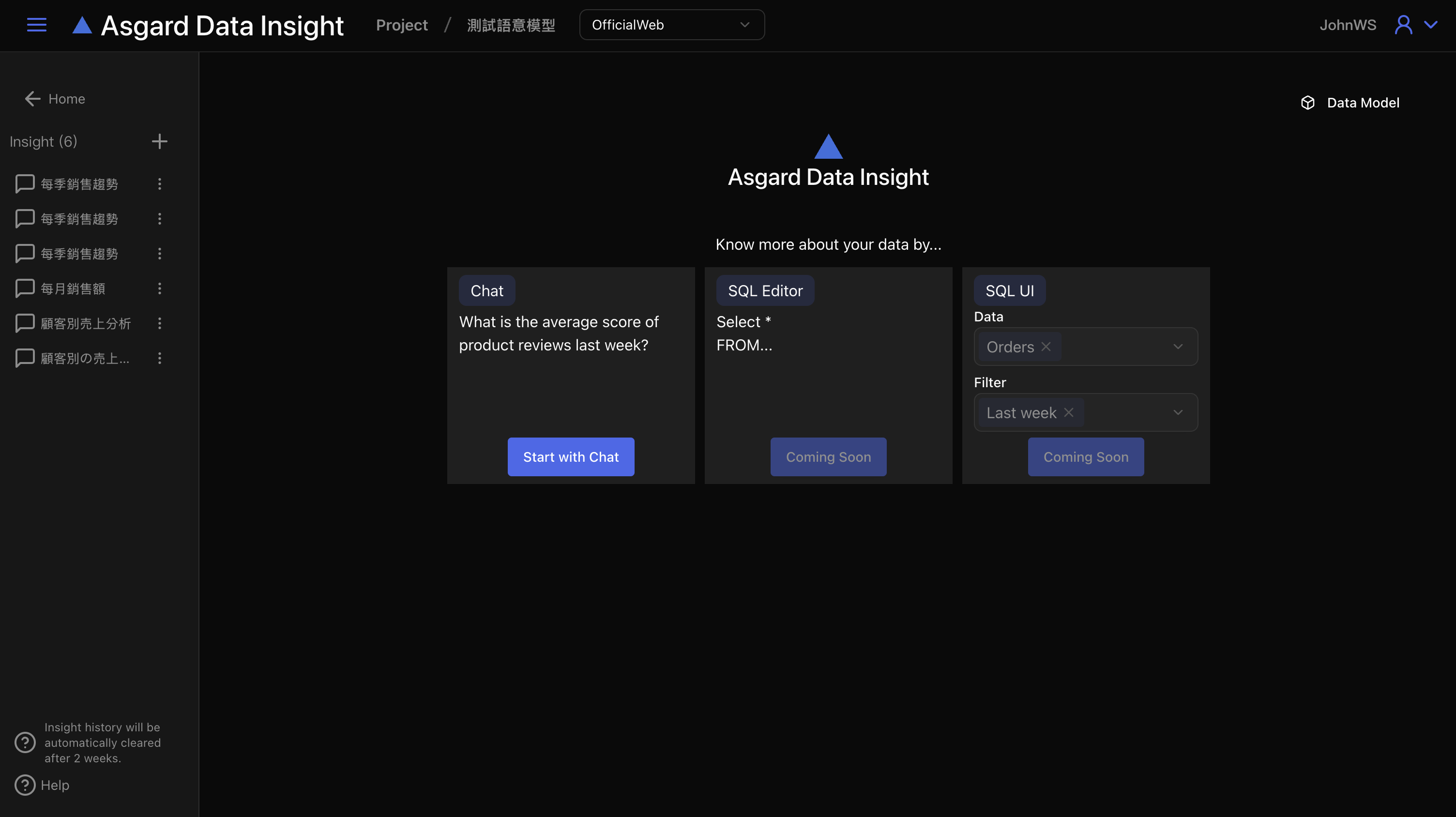 進入 Asgard Data Insight 的預設首頁會在新增一個新的 Insight (洞察),您可以直接點擊「Start new Insight」以進入。若專案有多個資料模型,可以在頂端列的模型名稱下拉選單點擊並切換不同的資料模型以繼續。
