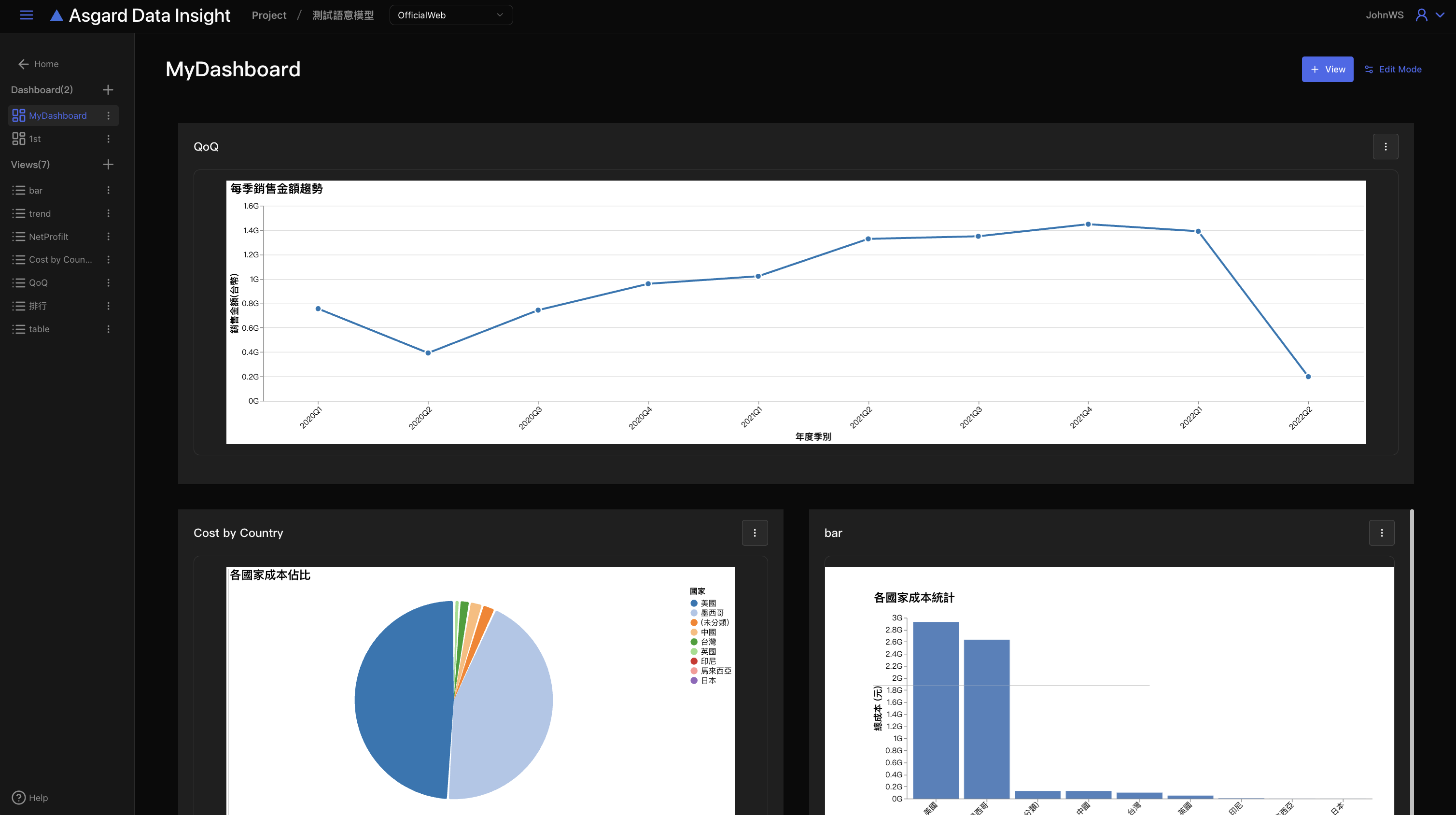 資料是 Data Insight 的核心。 您可以使用問與答來提出問題並探索資料,建立並且儲存圖表 (View) 和儀表板 (Dashboard), 視覺化效果 (Visualization) 和答案的基礎資料來自資料來源的語意模型 (Semantic Model)。