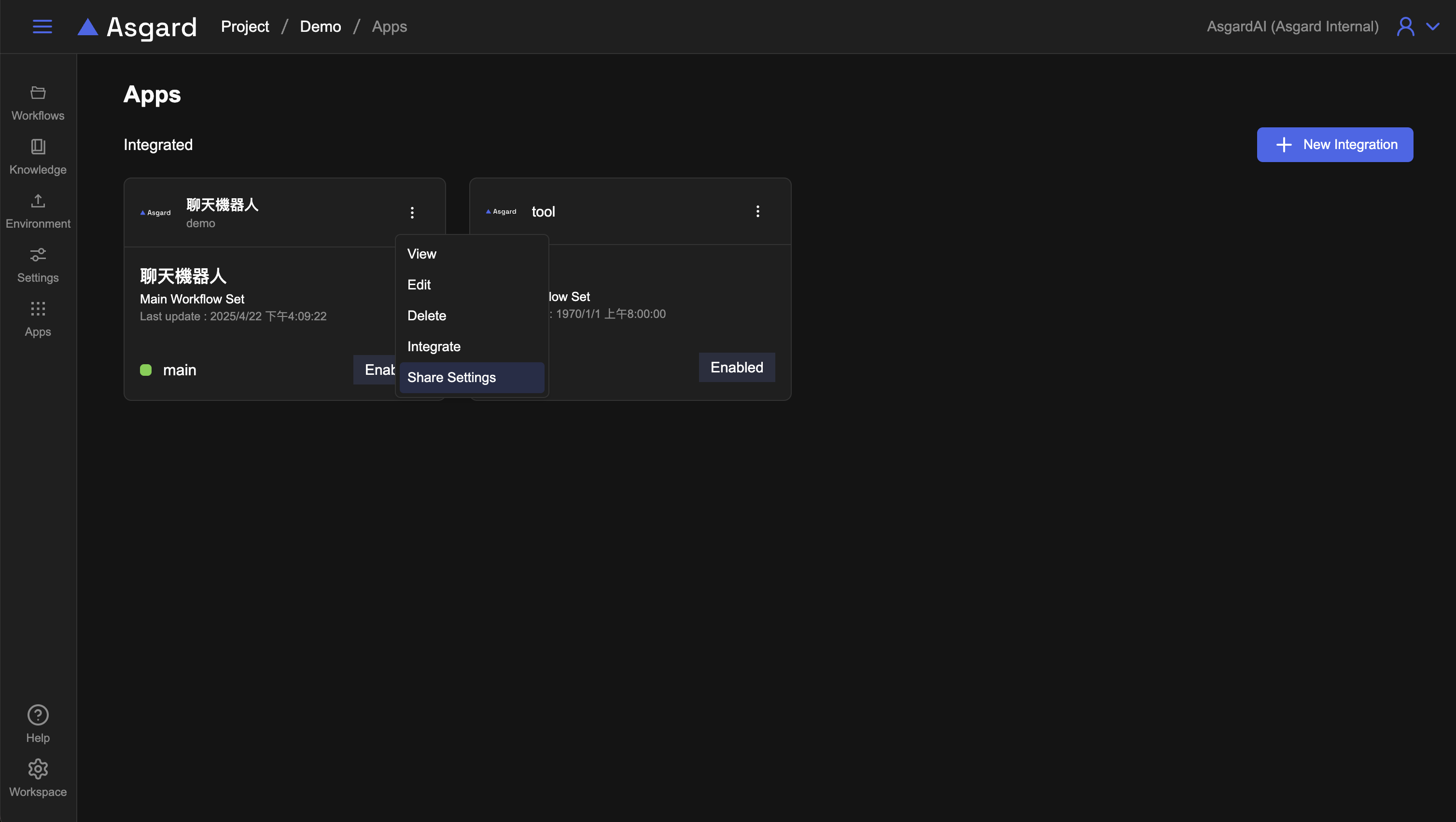 要調整這個驗證選項,直接前往 Apps → Integration → 選擇你的 Integration 右上角更多選單 → Edit,切換 Auth 開關與設定 API Key 即可。