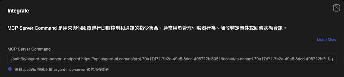 - 您會看到 MCP Server Command 與 JSON 格式的指令,在接下來的步驟3中會使用。