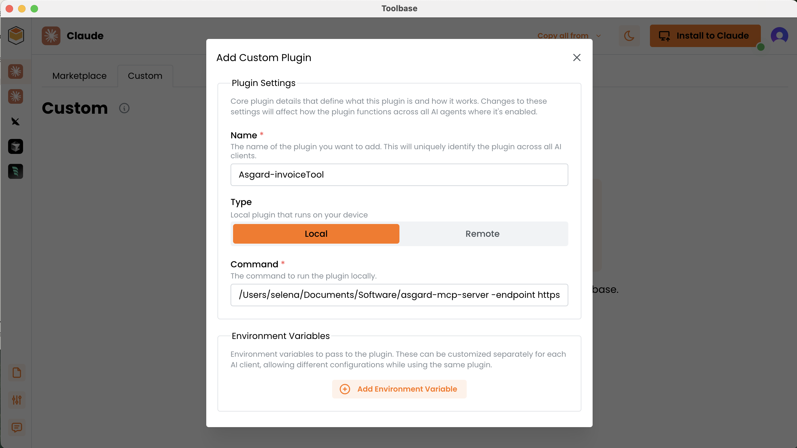 以 Toolbase 為例,點擊 Add Custom Plugin → 填入Name → Type: Local →填入 Command 後儲存。