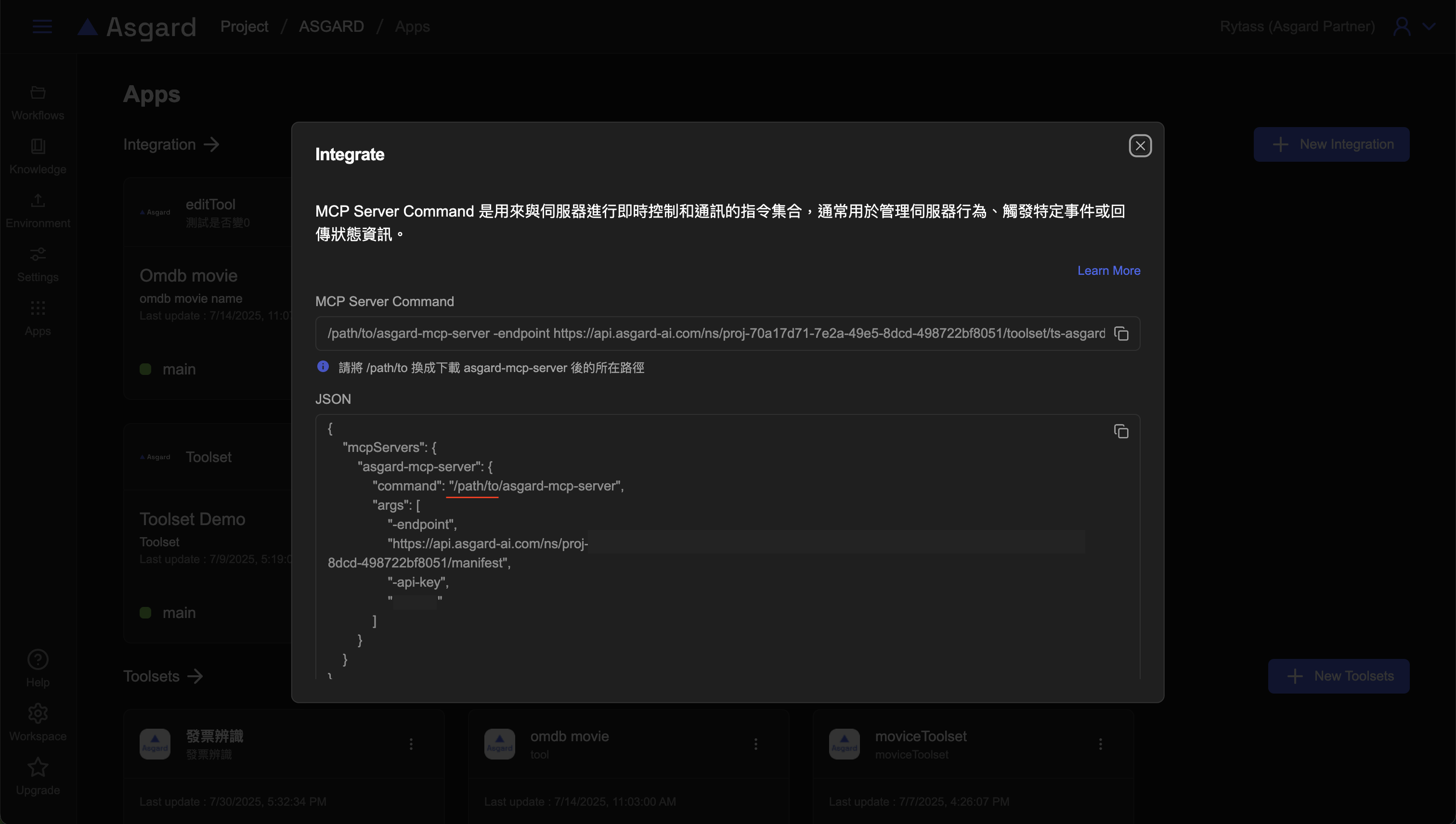 在 Asgard 中,你可以將 Toolsets 作為 MCP Server 來使用,讓你能夠在電腦上的 MCP Host 中直接使用 Asgard 的功能。
