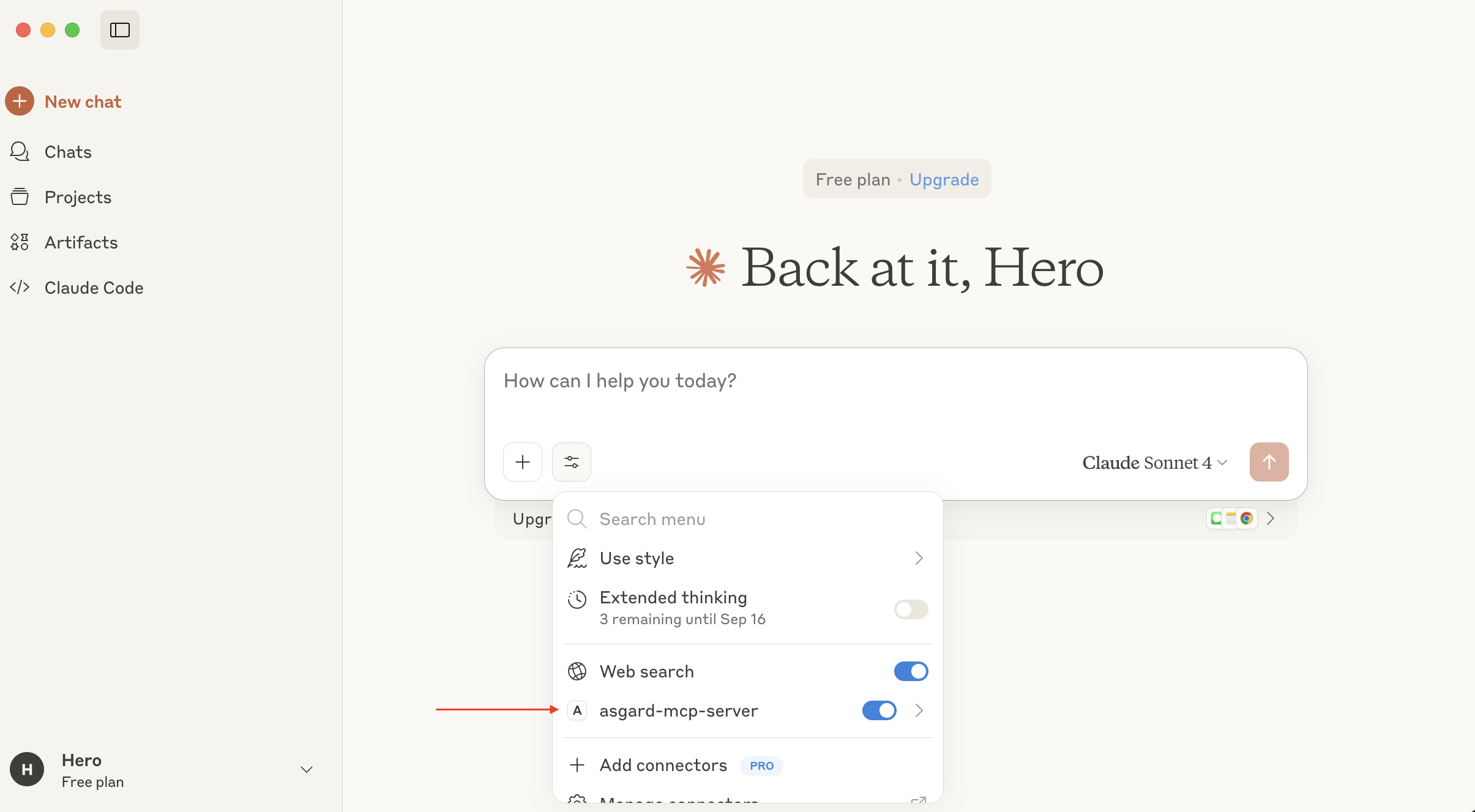 點擊 Allow 後,Claude Desktop 應可以在 Search and tools 的下拉式選單內看到 asgard-mcp-server