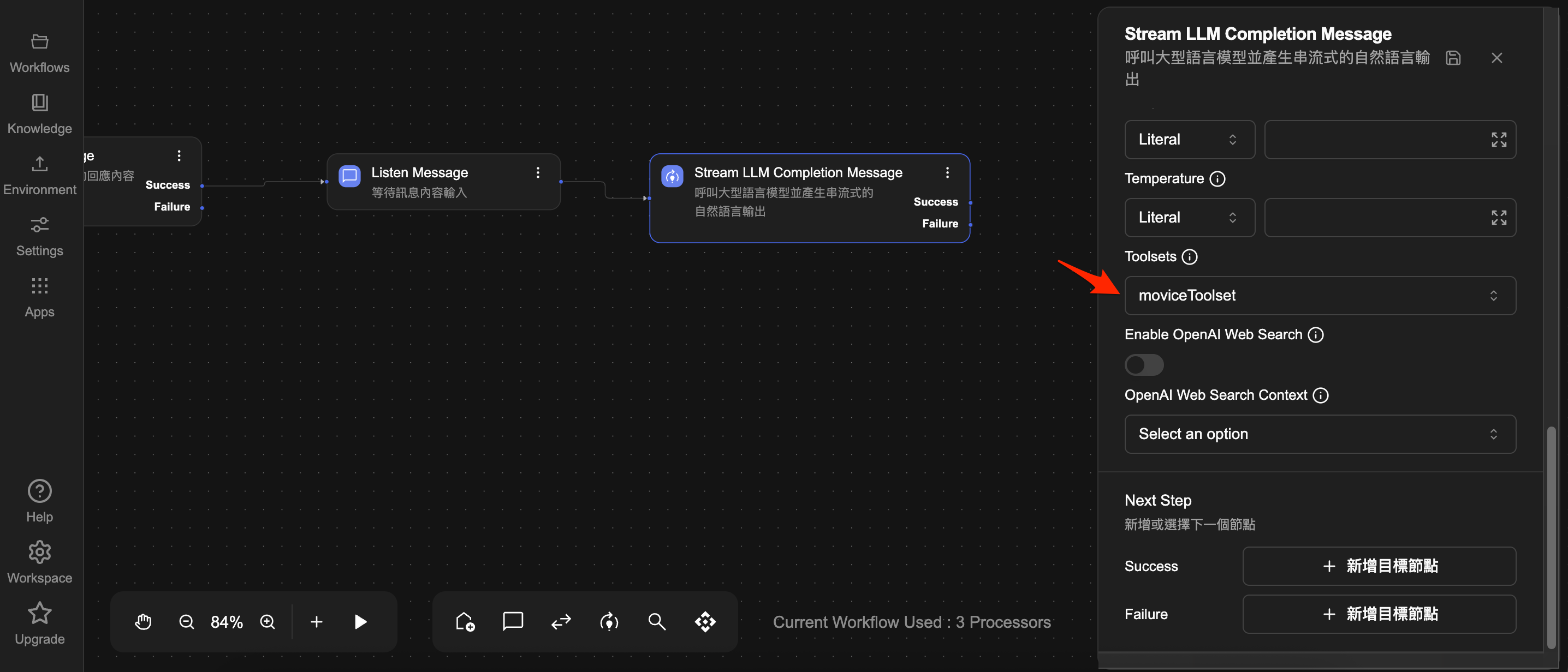接下來是最重要的步驟!在 LLM Completion 的 Toolsets 欄位中,可下拉選擇我們剛才建立好的 Toolset。