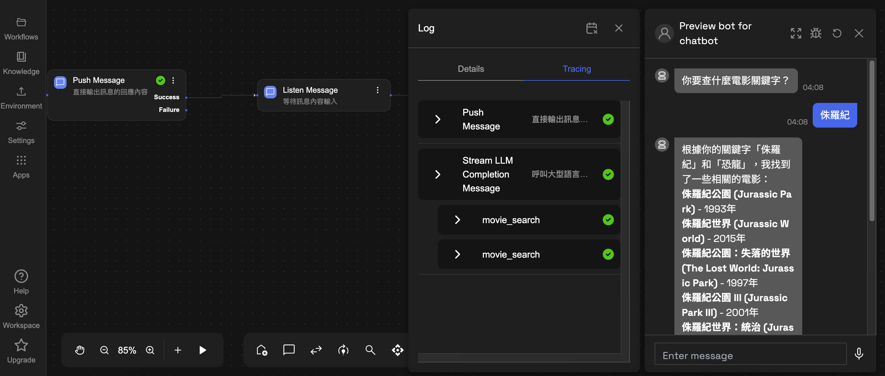 接著,AI 會把這些關鍵字一個一個丟進剛剛設定好的 Toolsets,讓每個工具去查詢電影資訊。你可以在追蹤記錄裡看到,AI 真的有把每個關鍵字都帶進 movie_search 參數裡,然後依照我們設計的格式(電影名稱(英文名)-上映時間)把結果整理出來。