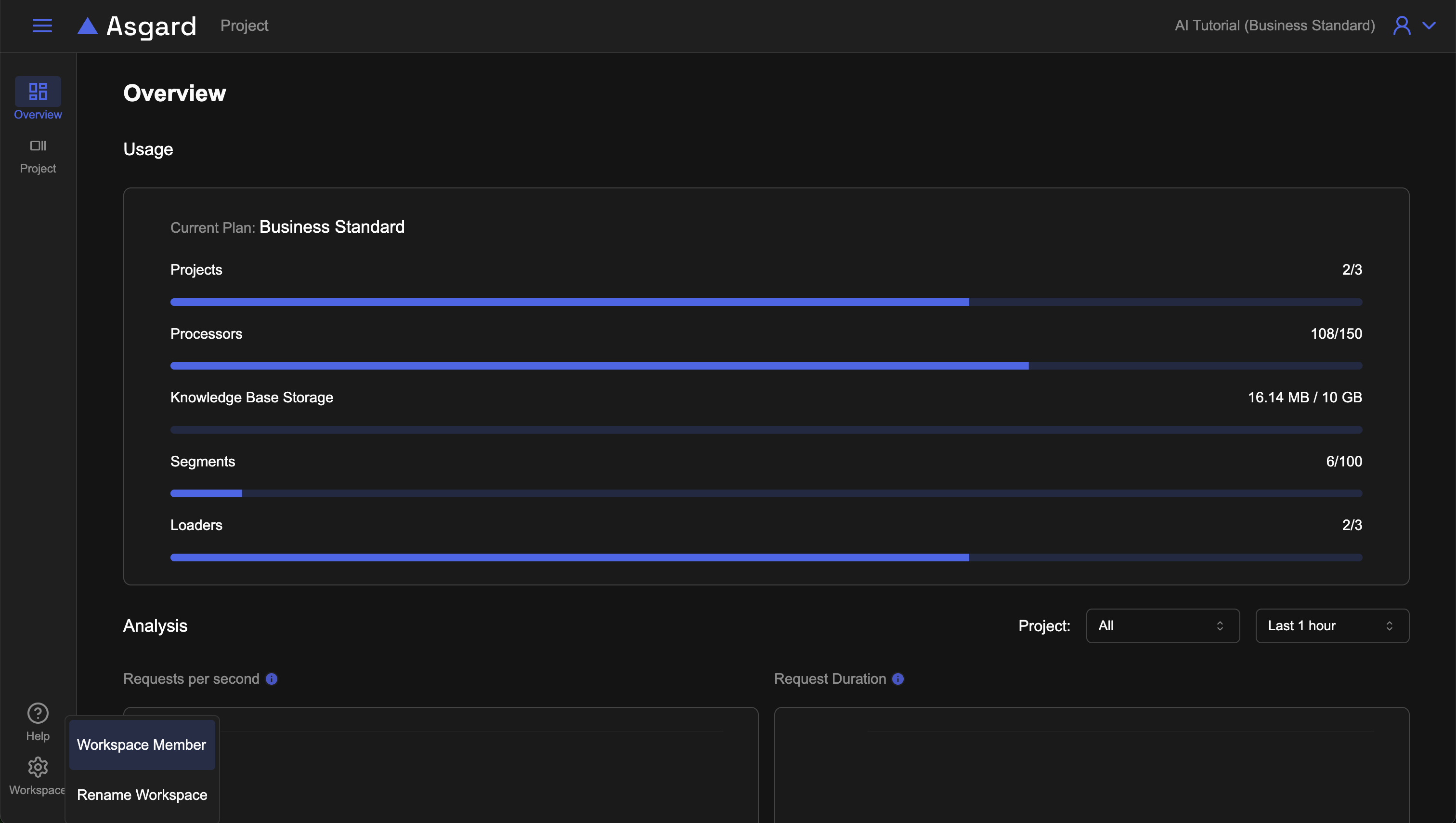成功加入Asgard AI並登入後,預設會進入工作空間的概覽頁面,您可以在此頁面檢視目前工作空間的使用情況,包含專案(Project)、處理節點(Processors)、知識庫儲存空間(Knowledge Base Storage)、分段(Segments)、擷取知識載入(Loaders)等,依據您購買的方案會有不同的額度使用呈現。