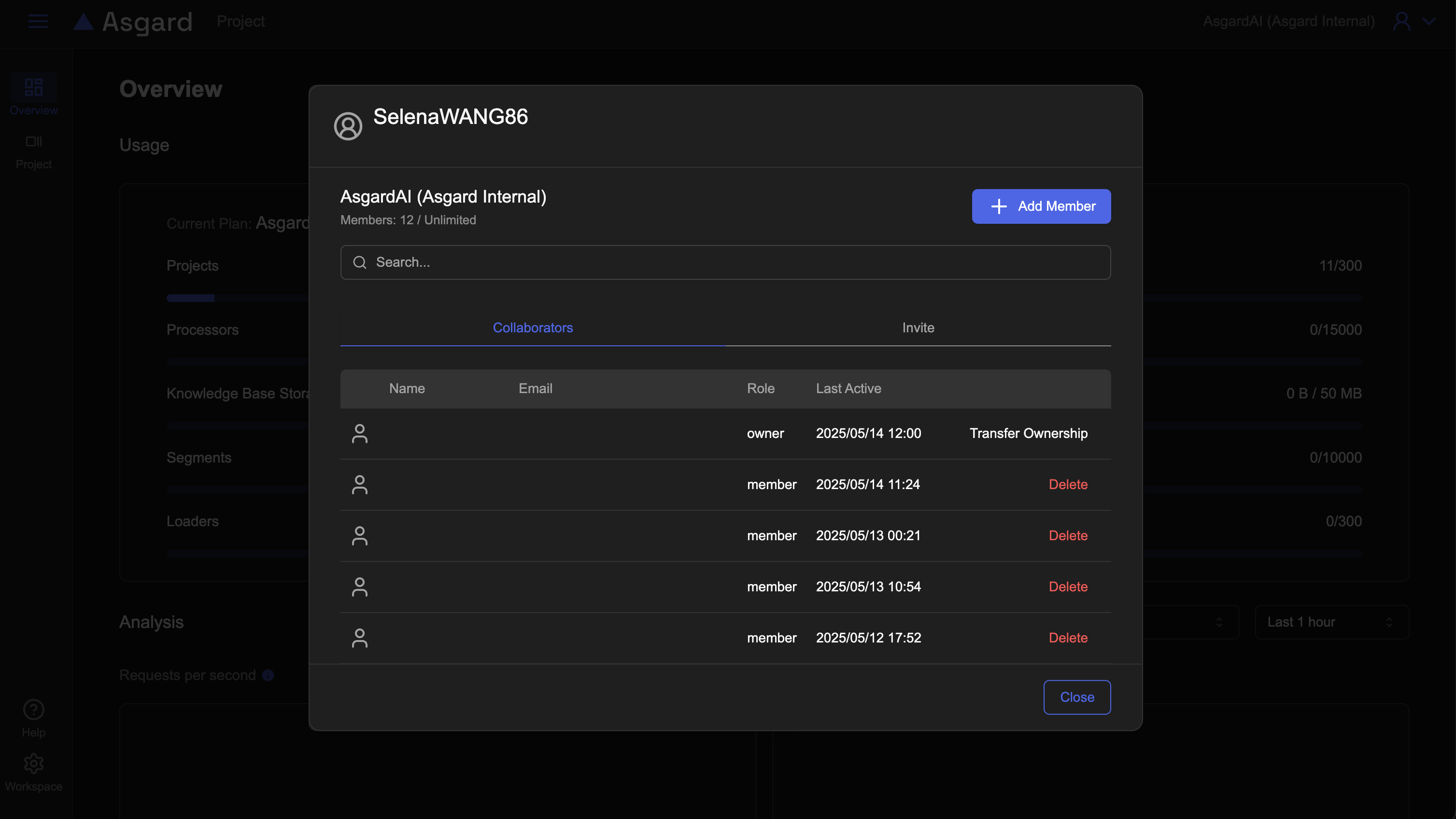 假如您為該工作空間的擁有者(Owner),在左下角的Workspace管理功能列,您可以看到Workspace Member與Rename Workspace的功能。您可以為您的工作空間修改名稱,也可以管理工作空間成員與邀請新成員加入。