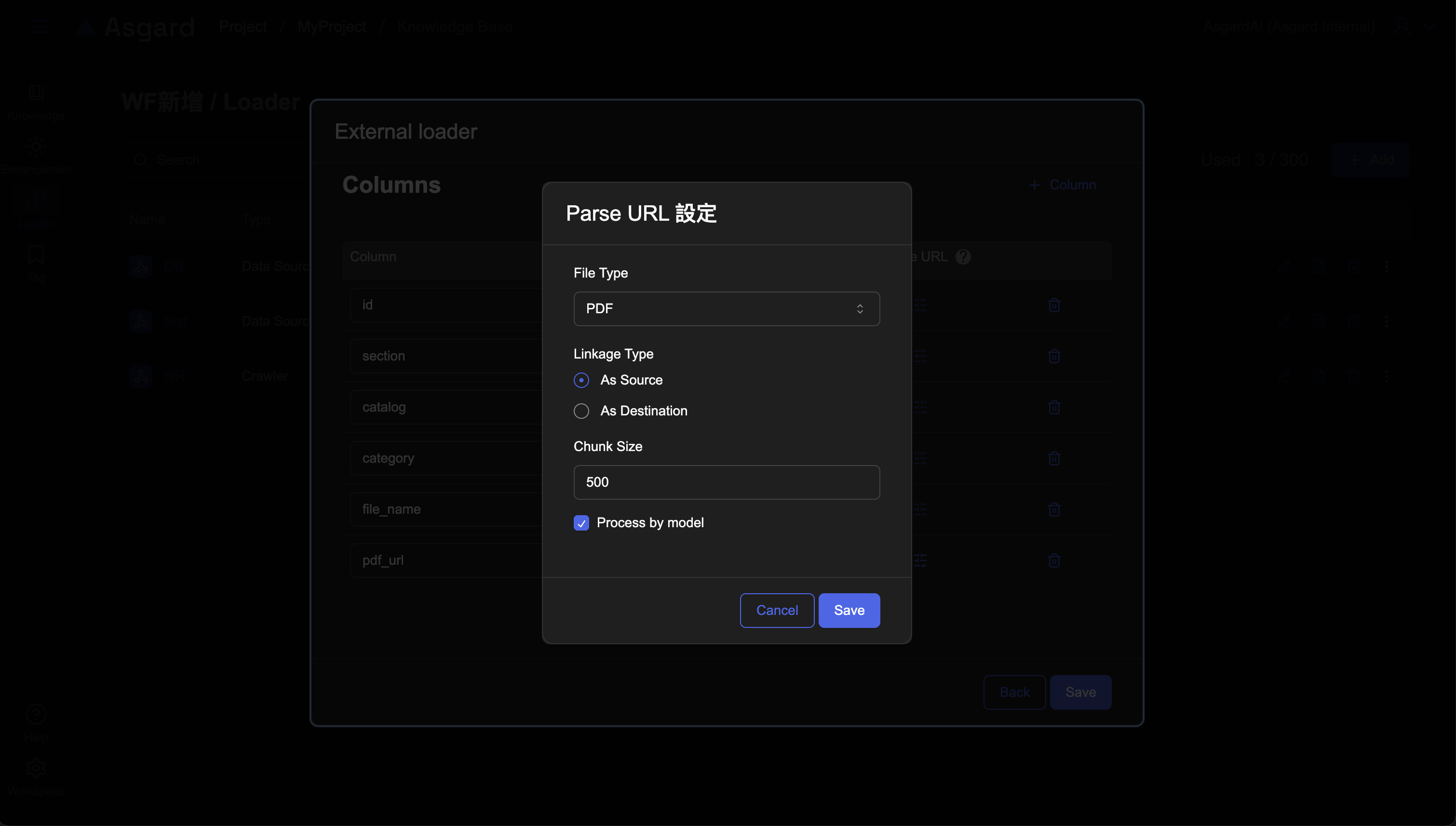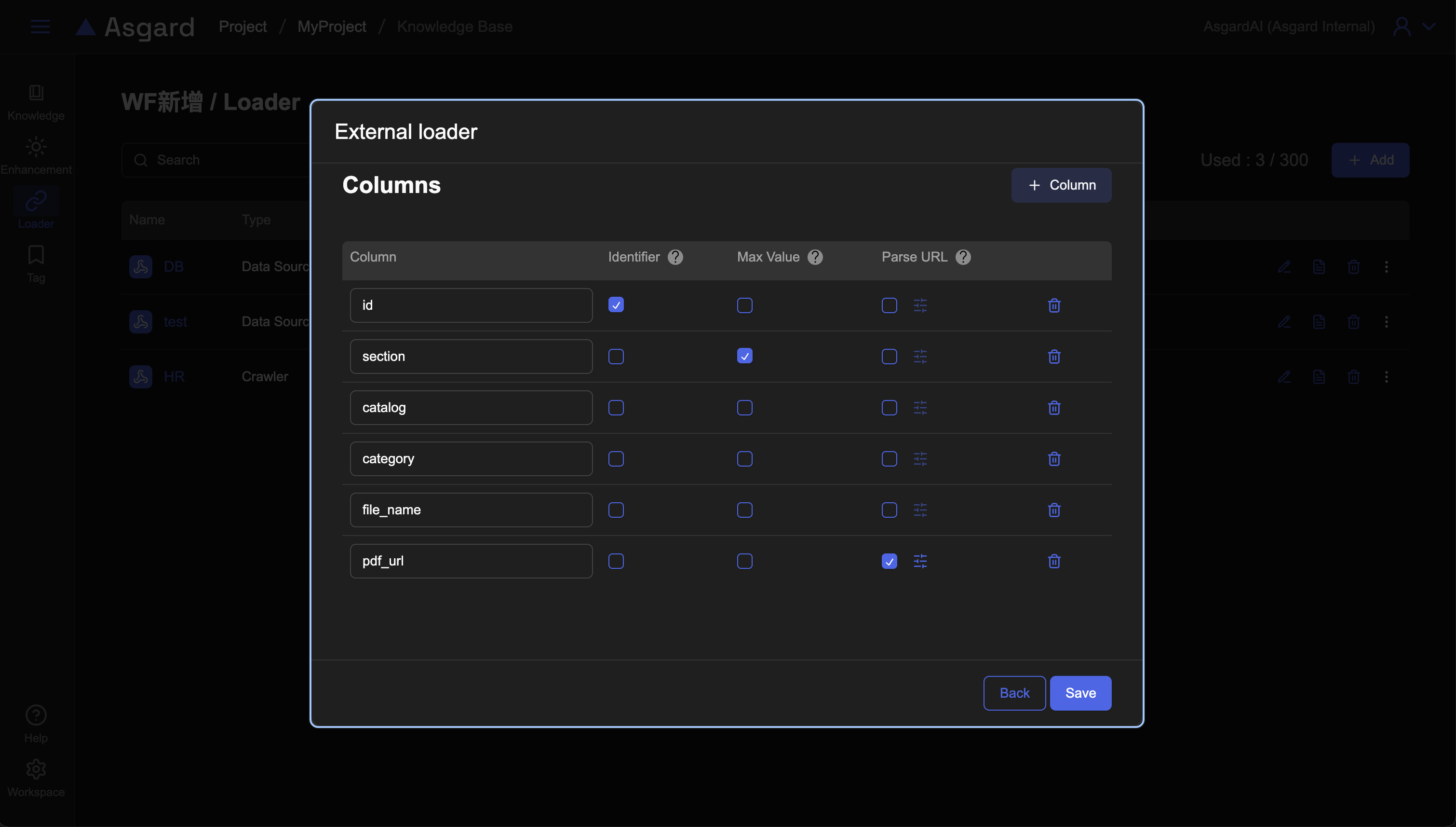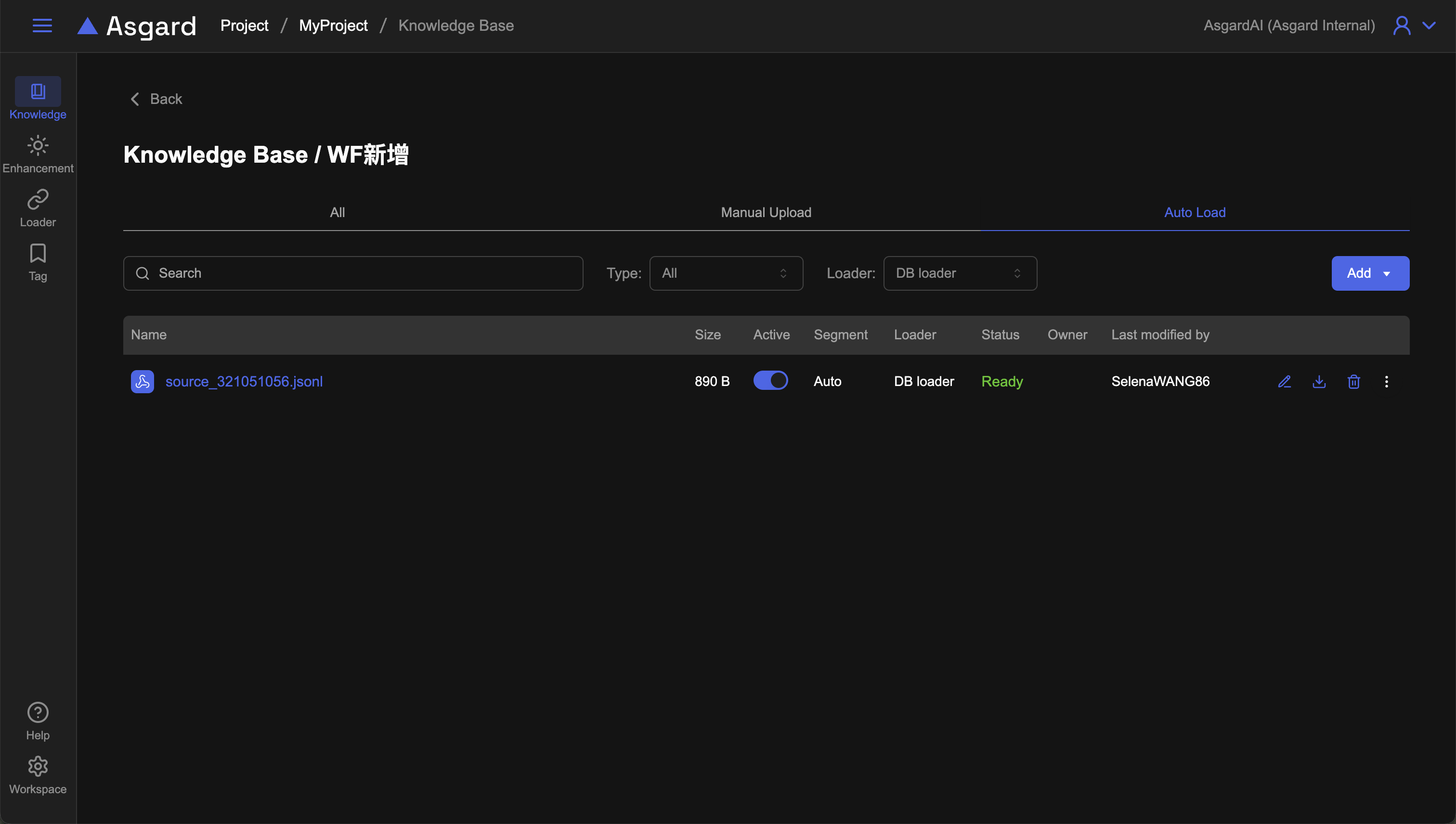 開始使用 Asgard讓 AI 學習知識擷取知識載入-使用Loader定期排程從資料庫取得本頁導覽從資料庫取得Asgard 提供了自動化的擷取知識載入(Loader)的功能,能夠讓您一次設定好資料的來源與排程,後續皆交由系統自動化幫您更載入即可,省時有效率。 前置作業:已在 Settings 的 Data Soure 設定好可正常連線的資料來源。 可以在知識庫列表的「Add」按鈕點擊後選擇「Auto Load」或是直接進到左側 Loader 功能列表後,點擊「Add」新增。 新增 Data Source Loader