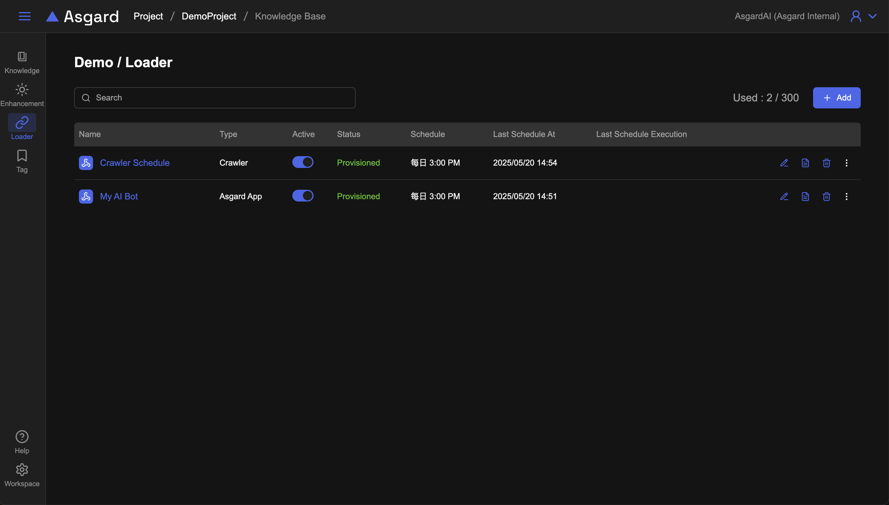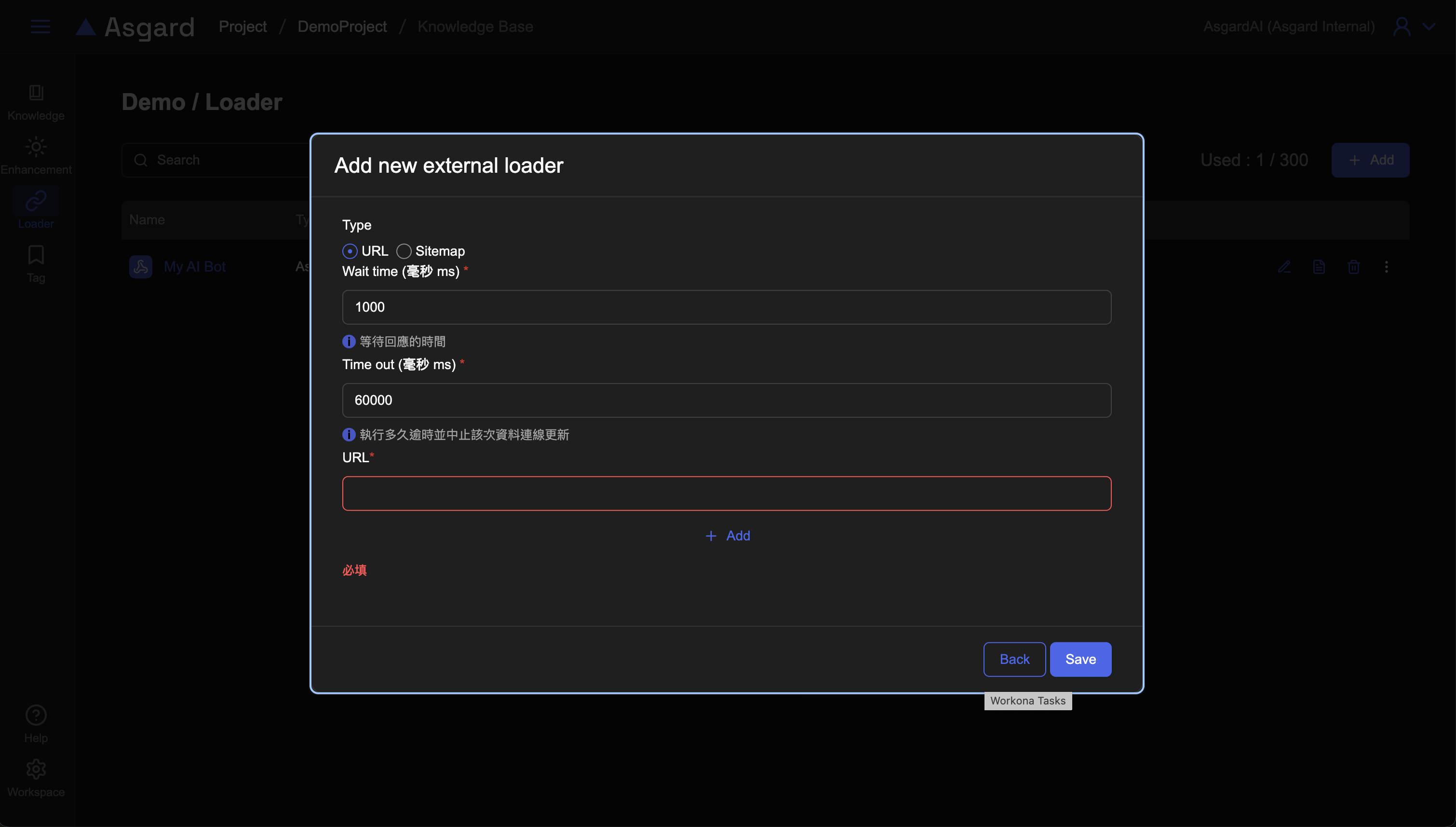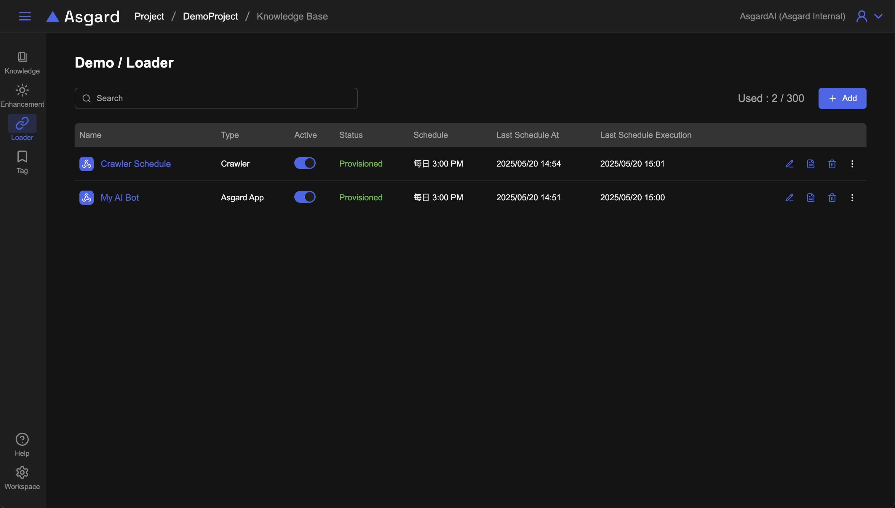 開始使用 Asgard讓 AI 學習知識擷取知識載入-使用Loader定期排程從網路爬蟲載入本頁導覽從網路爬蟲載入Asgard 提供了自動化的擷取知識載入(Loader)的功能,能夠讓您一次設定好資料的來源與排程,後續皆交由系統自動化幫您更載入即可,省時有效率。 前置作業:可正常使用的網路爬蟲 URL 或 Sitemap URL。 可以在知識庫列表的「Add」按鈕點擊後選擇「Auto Load」或是直接進到左側 Loader 功能列表後,點擊「Add」新增。 新增 Crawler Loader