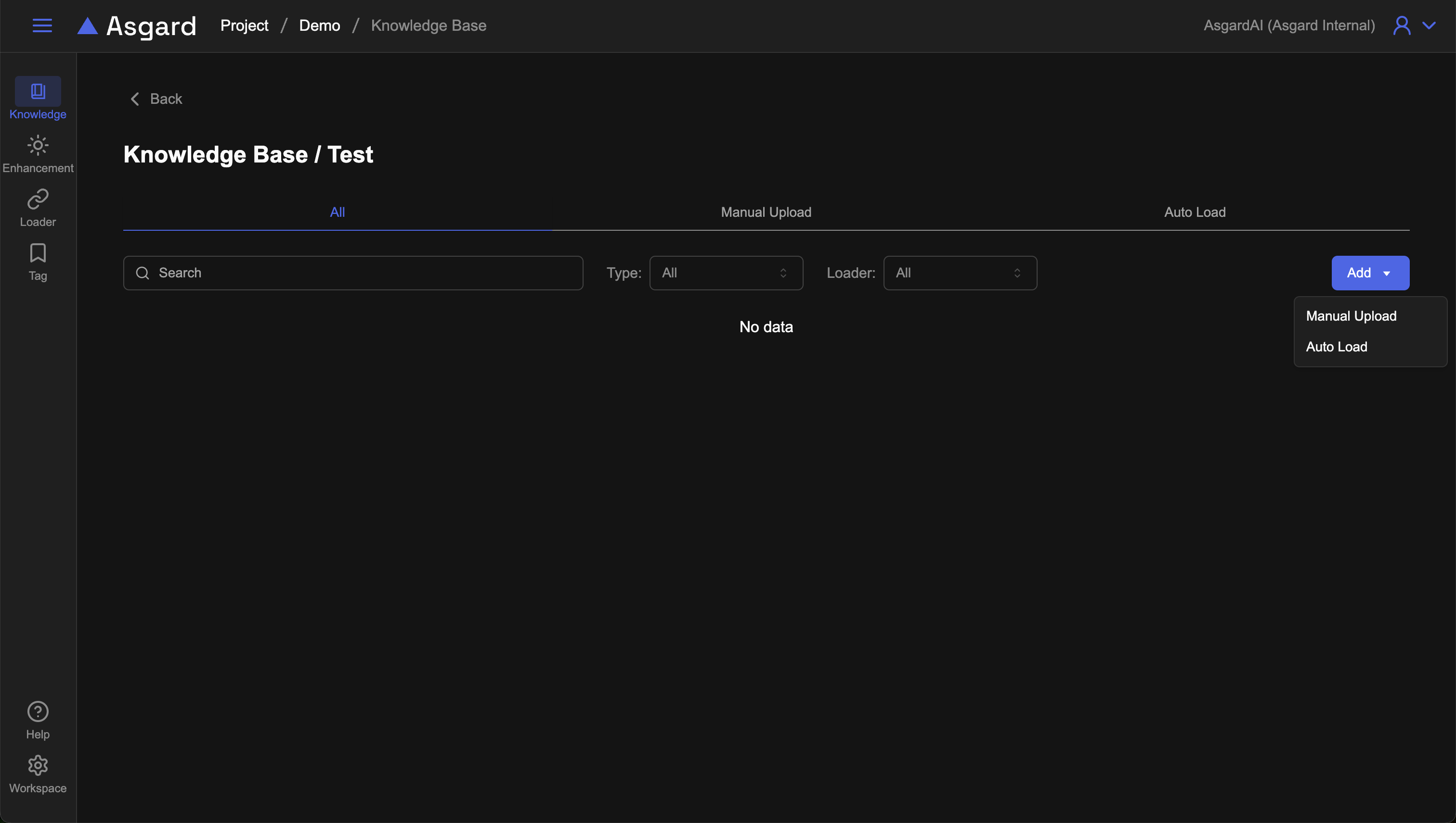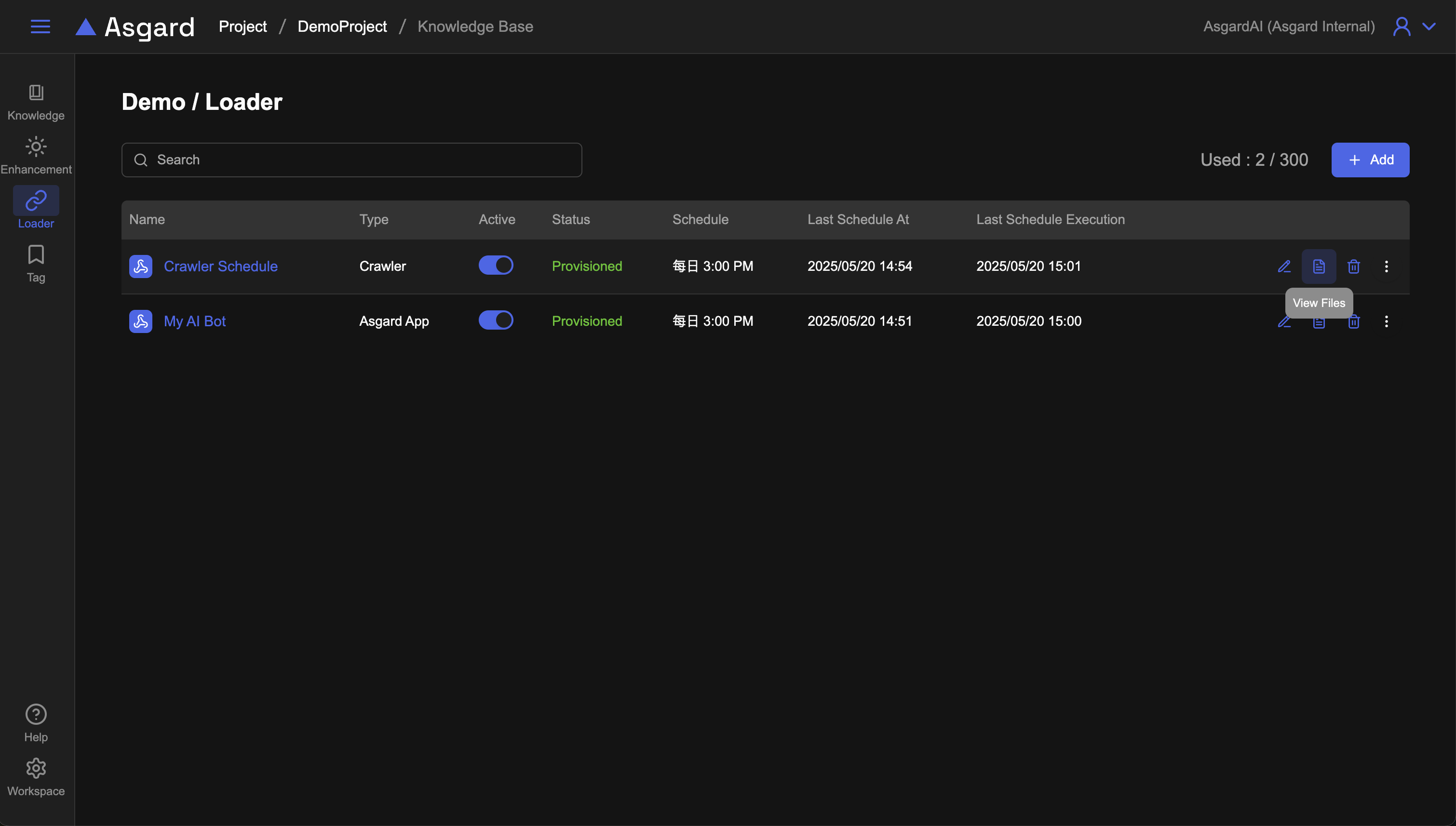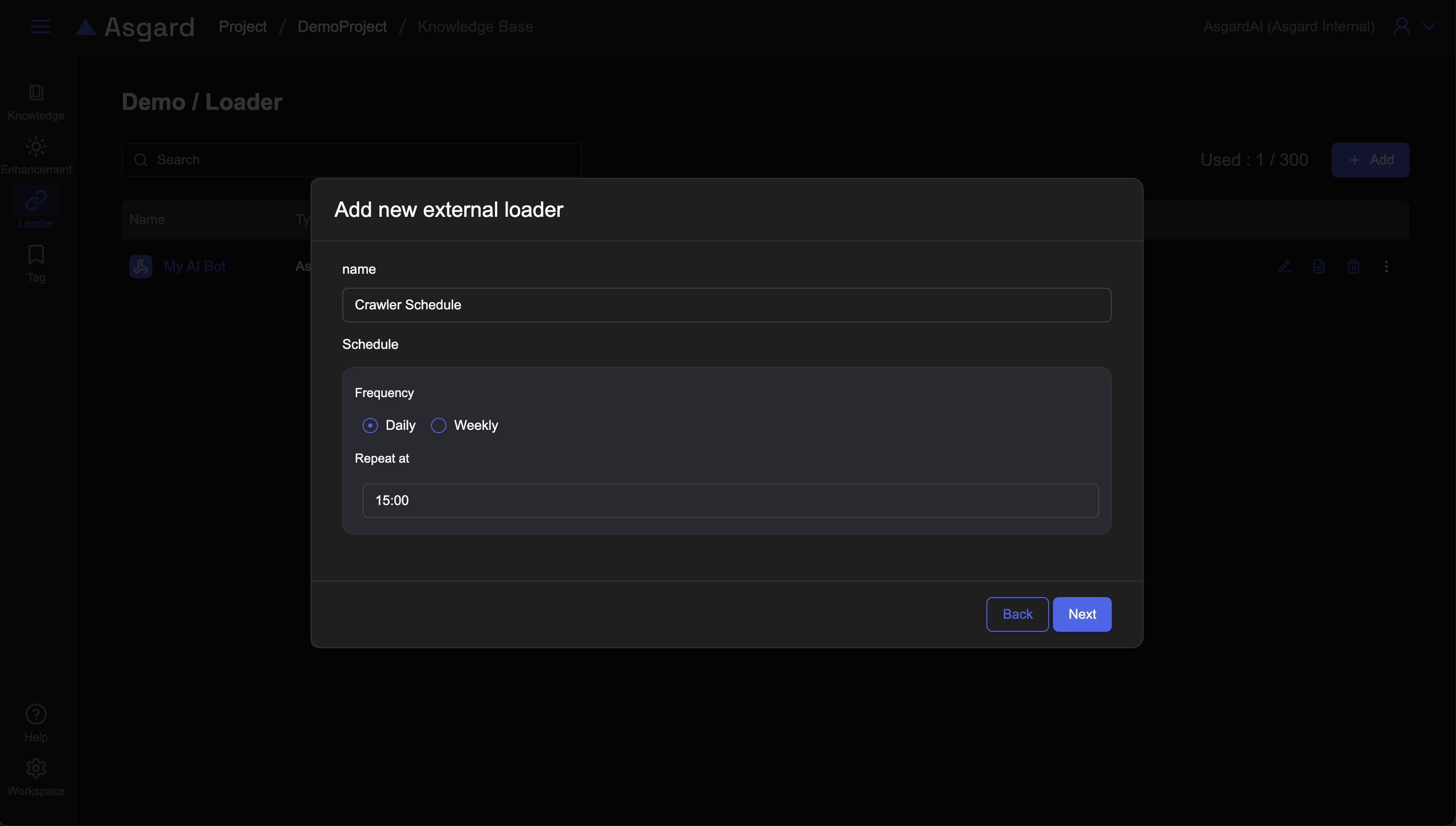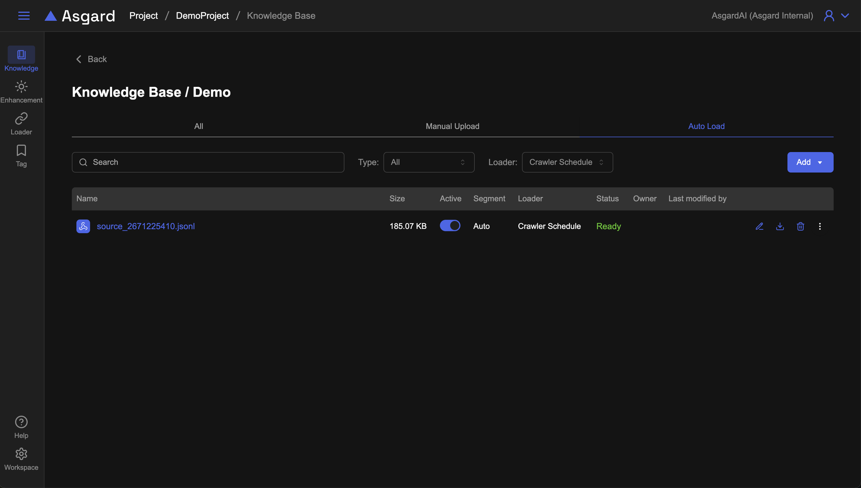開始使用 Asgard讓 AI 學習知識擷取知識載入-使用Loader定期排程從網路爬蟲載入本頁導覽從網路爬蟲載入Asgard 提供了自動化的擷取知識載入(Loader)的功能,能夠讓您一次設定好資料的來源與排程,後續皆交由系統自動化幫您更載入即可,省時有效率。 前置作業:可正常使用的網路爬蟲 URL 或 Sitemap URL。 可以在知識庫列表的「Add」按鈕點擊後選擇「Auto Load」或是直接進到左側 Loader 功能列表後,點擊「Add」新增。 新增 Crawler Loader