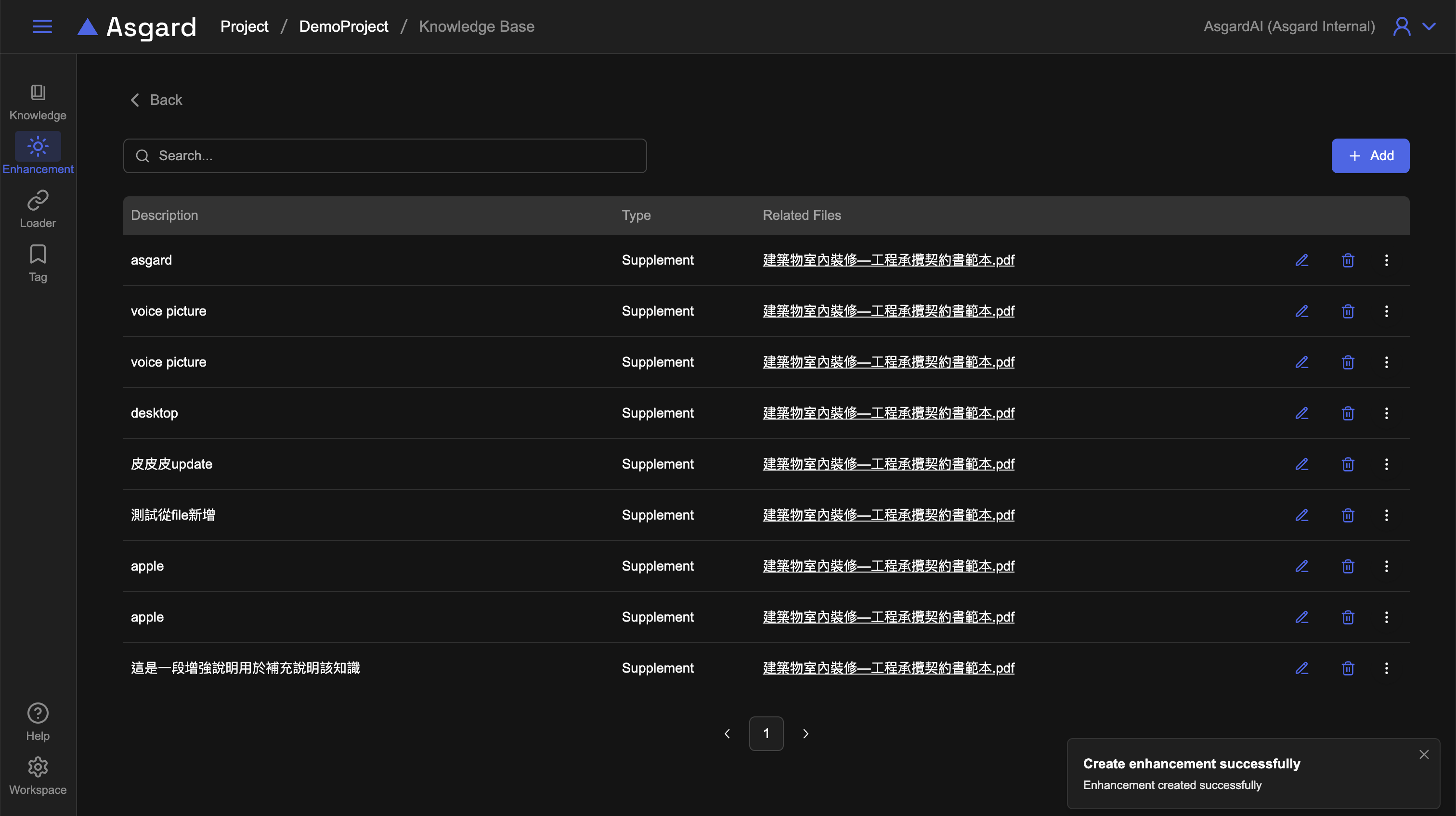 點擊右上角的「+ Add」進入新增 Enhancement 設定,此處設定與由檔案內新增相同,有三種增強類型可以選擇:補充內容(Supplement)、問題(Question)、答案(Answer)。在填寫增強時,可以上傳檔案作為補充資料(選填);可以勾選是否要將該增強加入向量搜尋。