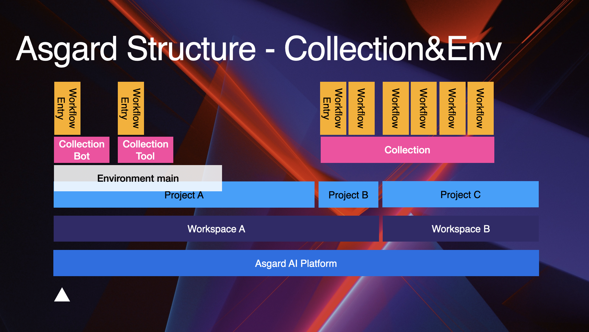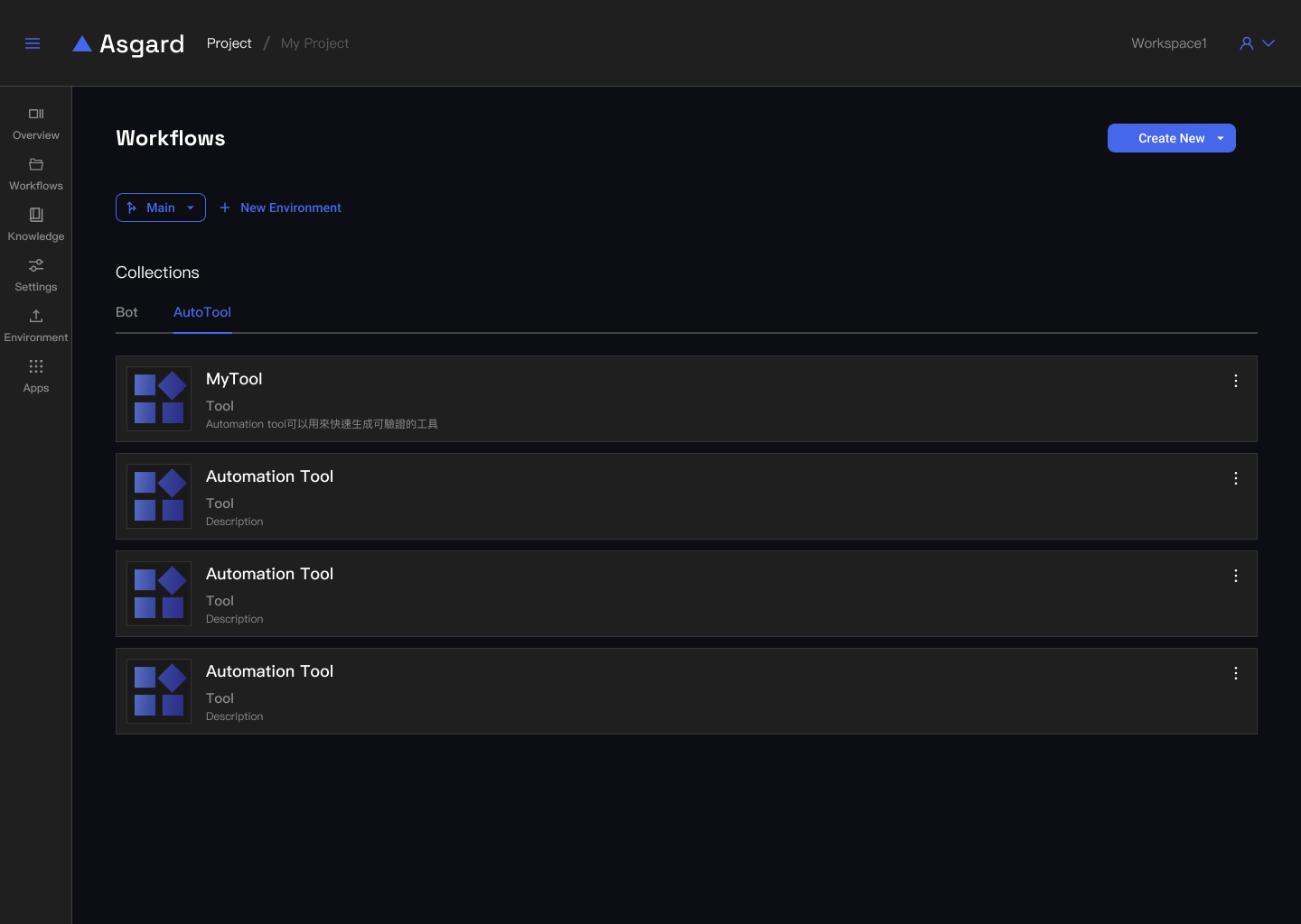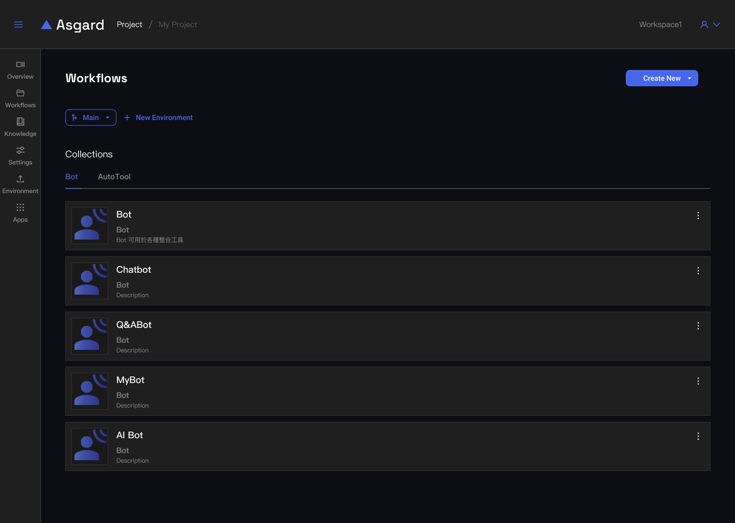 建立好 Project 之後,系統預設會幫您建立主要工作環境(Main),在主要工作環境可以繼續新增類型為 Bot 或是 Automation Tool 的 Collection,Collection 是一群 workflow 的集合,在 Collection 裡會有主要且唯一的 workflow 起點,也就是工作流程的進入點。