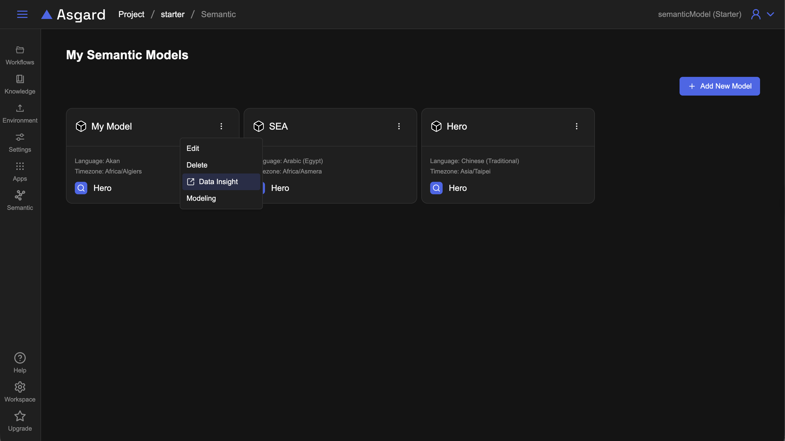 開始使用 AsgardSemantic Model使用模型建立圖表或儀表板本頁導覽使用模型建立圖表或儀表板可以使用建立好的模型,透過 AI 對話產生資料洞察圖表。 從 Semantic Model 進到 Data Insight 分析 可以透過列表頁或是詳細頁進入,更多詳細功能請參考 Data Insight Dashboard 管理。