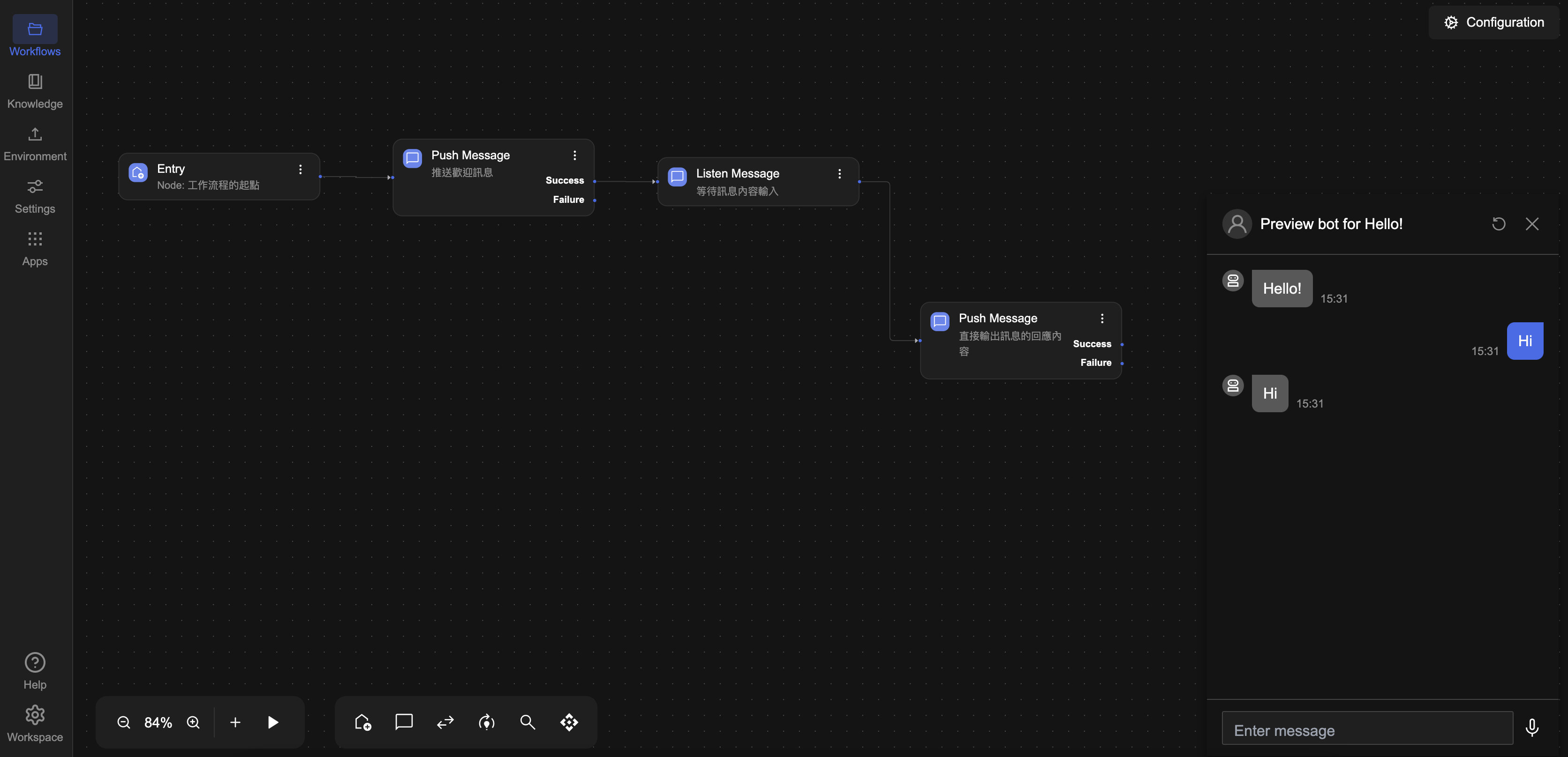 設定完成後,點選畫面左下方的 ▶️ Preview 按鈕以執行工作流程。執行後,畫面將跳出對話訊息視窗,即可看到機器人回應:「Hello」,這表示流程已正確運作。