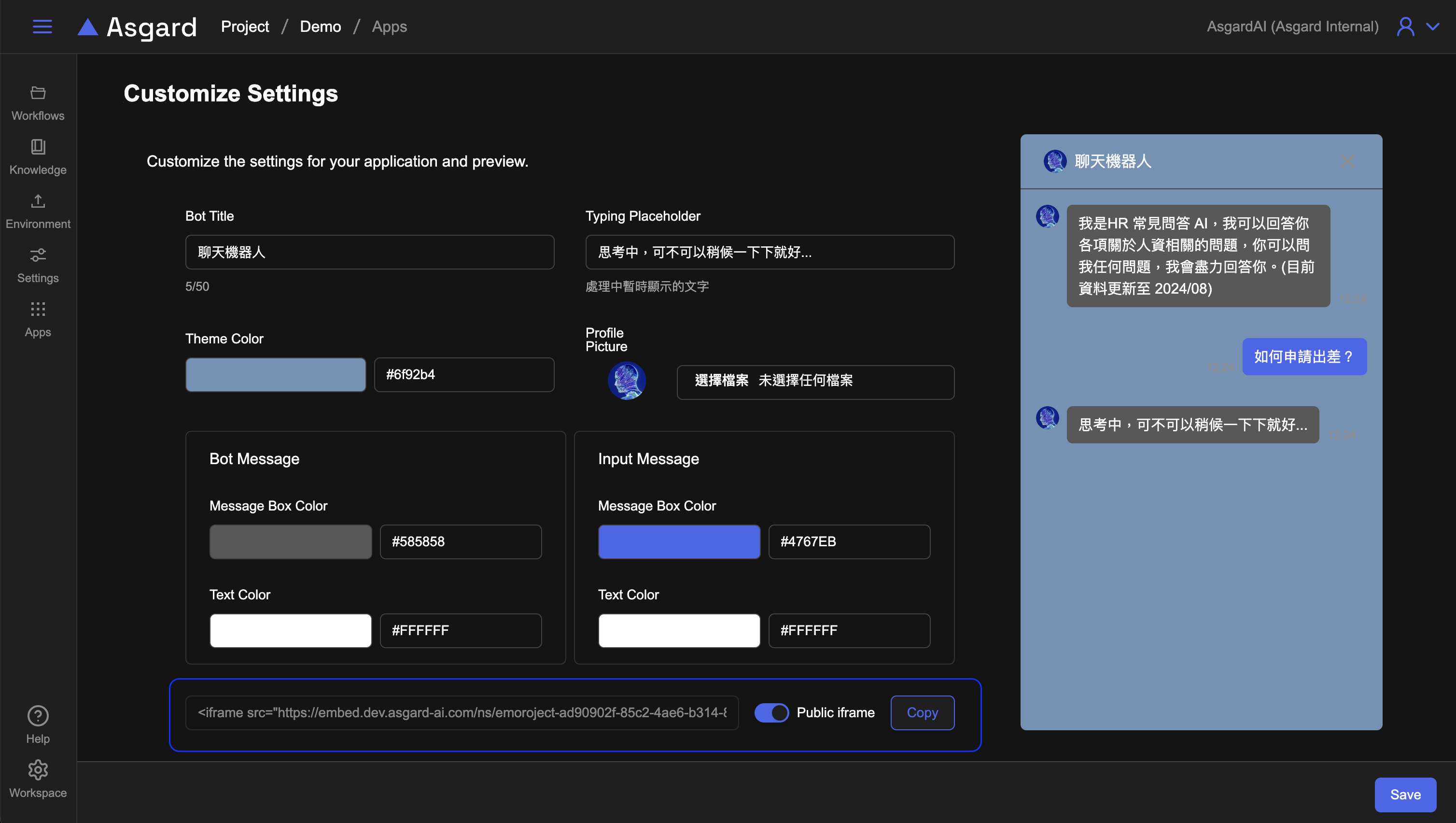Asgard 提供了設定應用 Apps 與 iFrame 發佈,讓您在完成工作流程編排並且預覽正常後,可以整合至現有服務例如 LINE、Discord、Slack、Telegram 等,亦可用 Asgard 的 Generic App 來彈性的自訂畫面或是使用 Public iFrame 的功能,讓您能馬上將 Asgard Bot 嵌入至現有服務中,快速驗證價值。