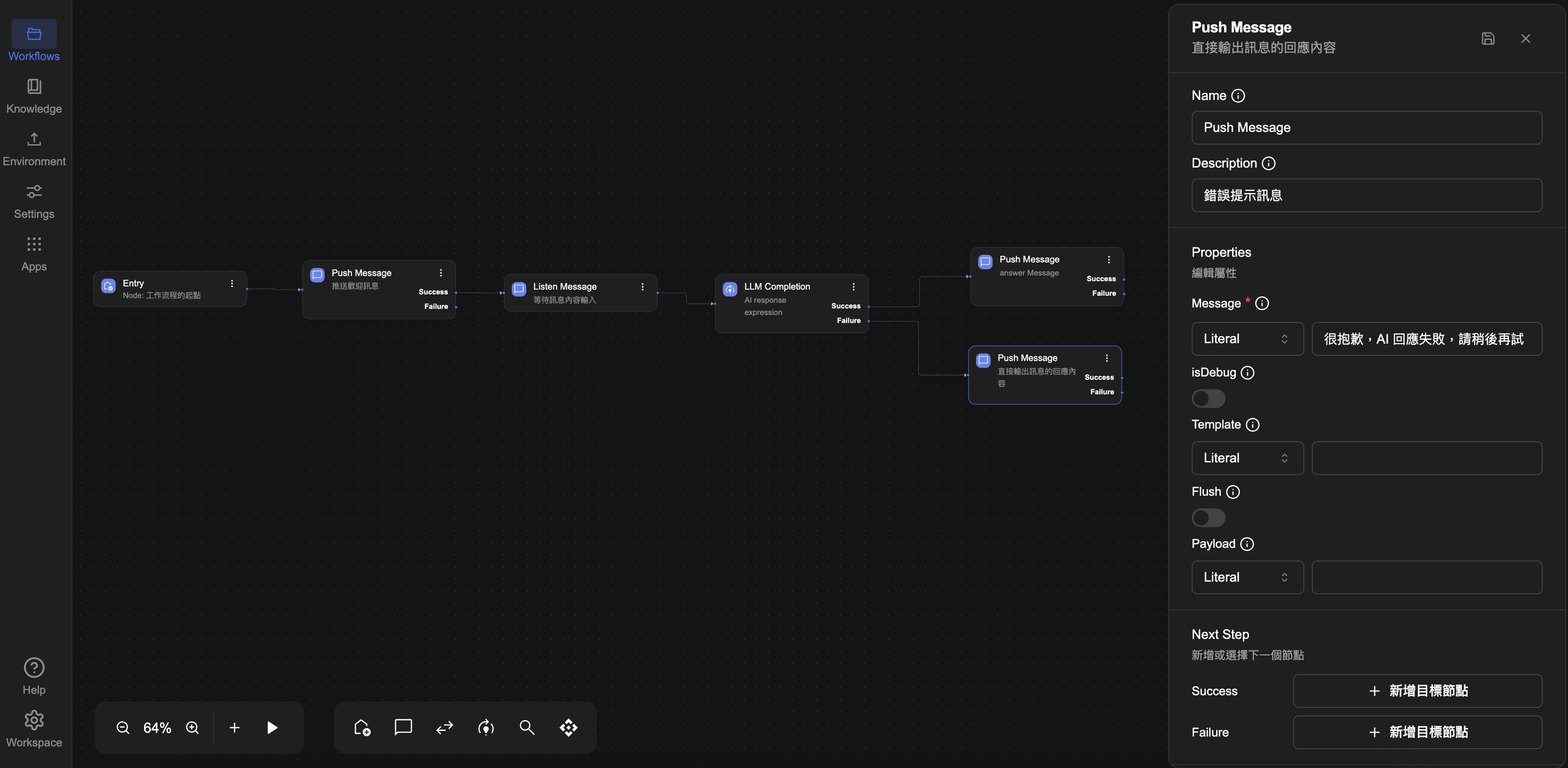STEP 5:Push Message 處理節點 回應AI生成內容與錯誤訊息