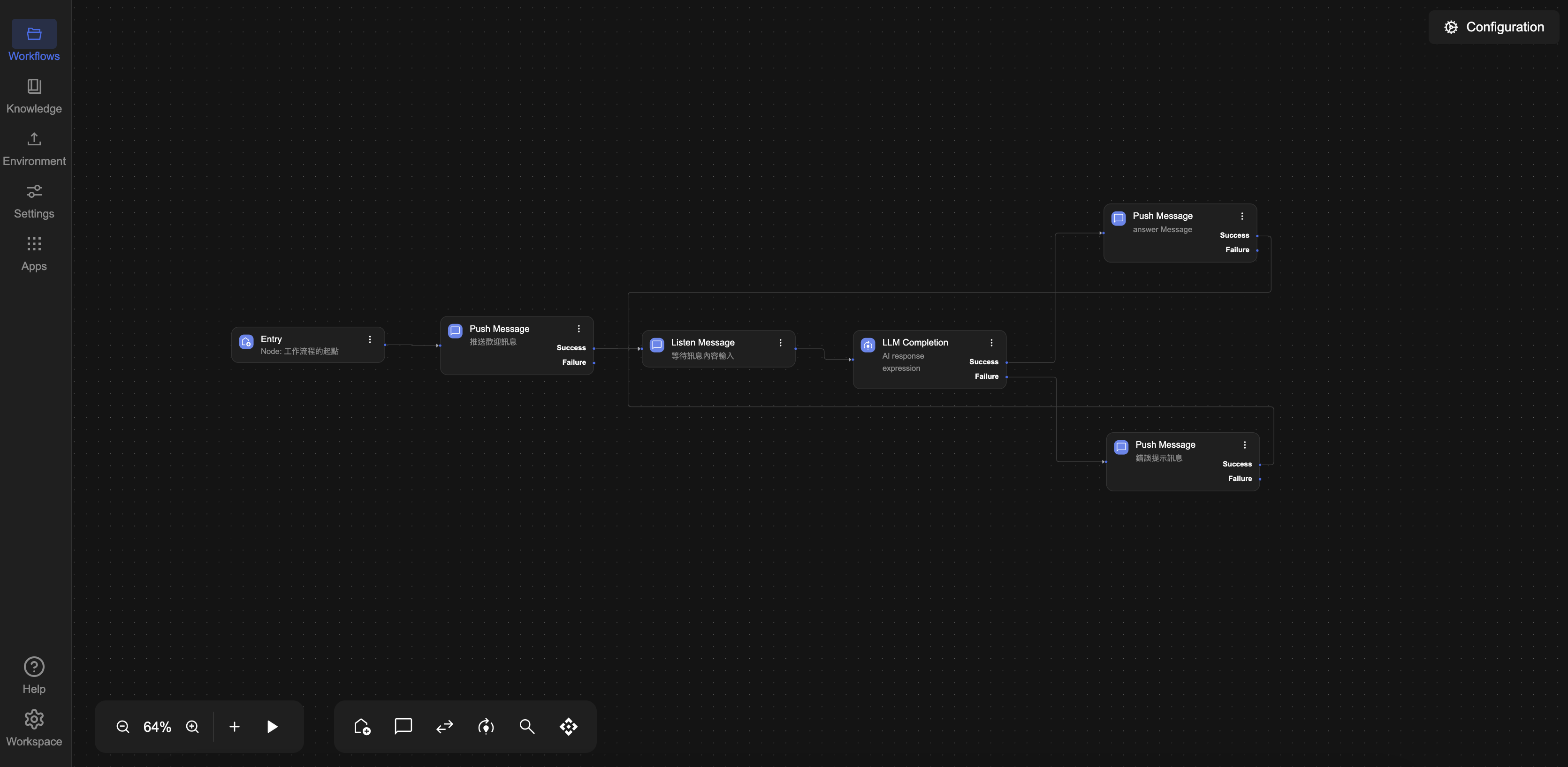 • LLM Completion 節點:具有 successfailure 兩種輸出路徑,可用於處理推論過程中的錯誤(如 API 失敗、Token 超限等)。