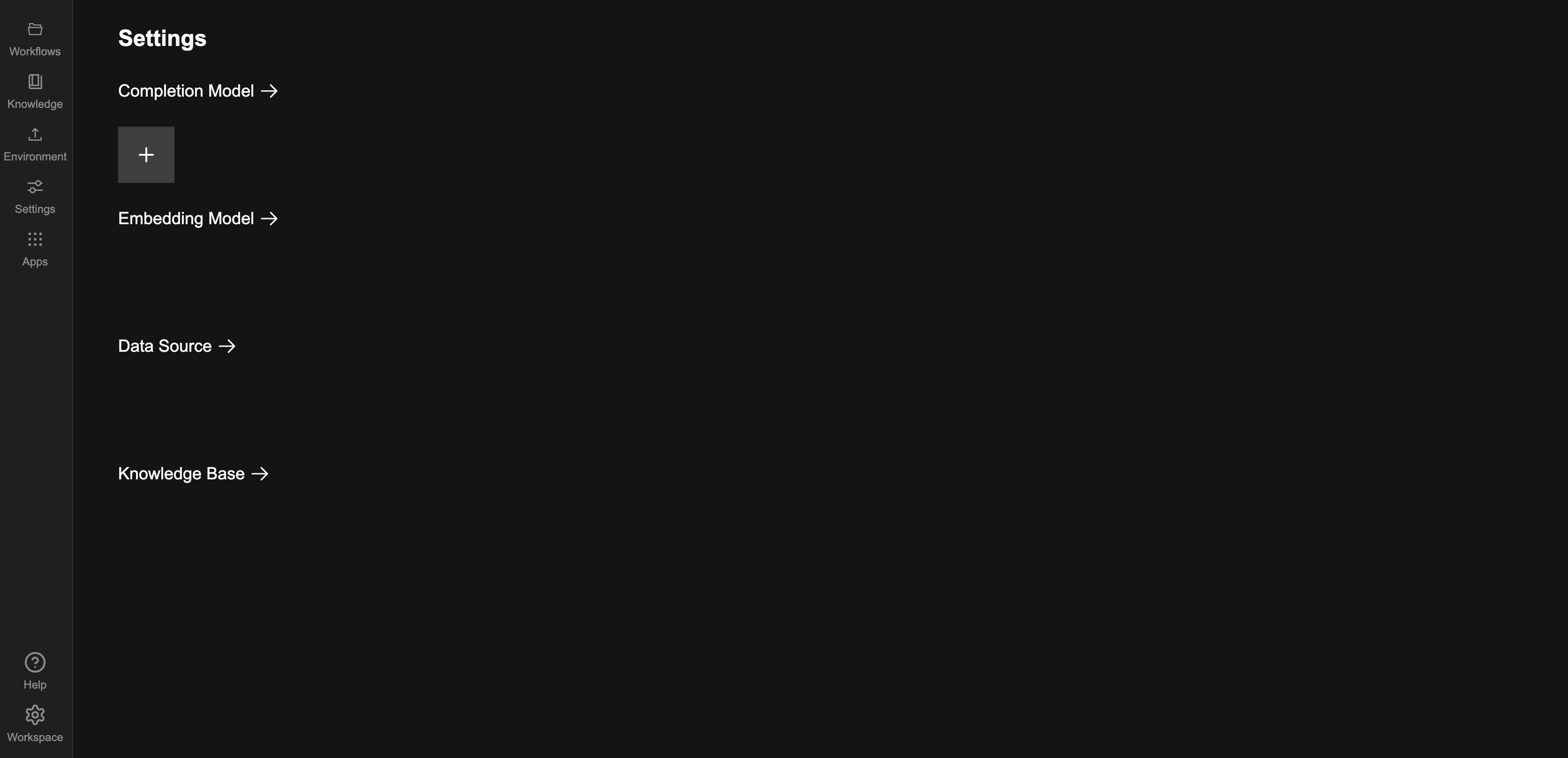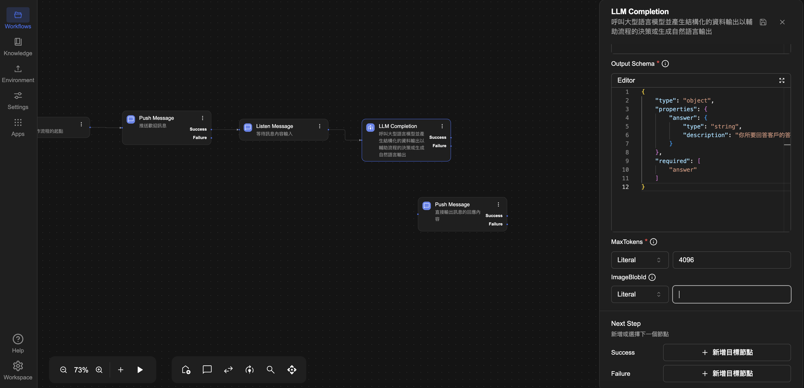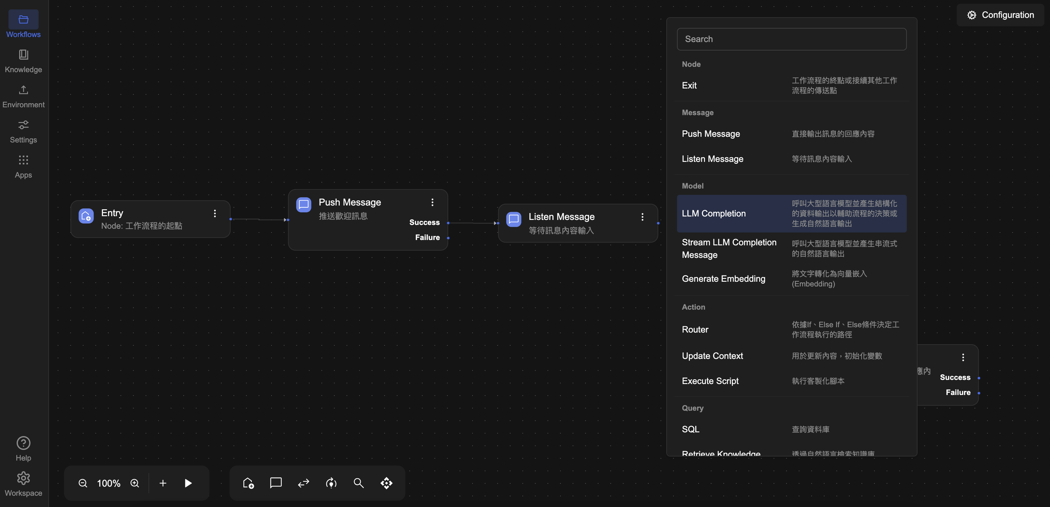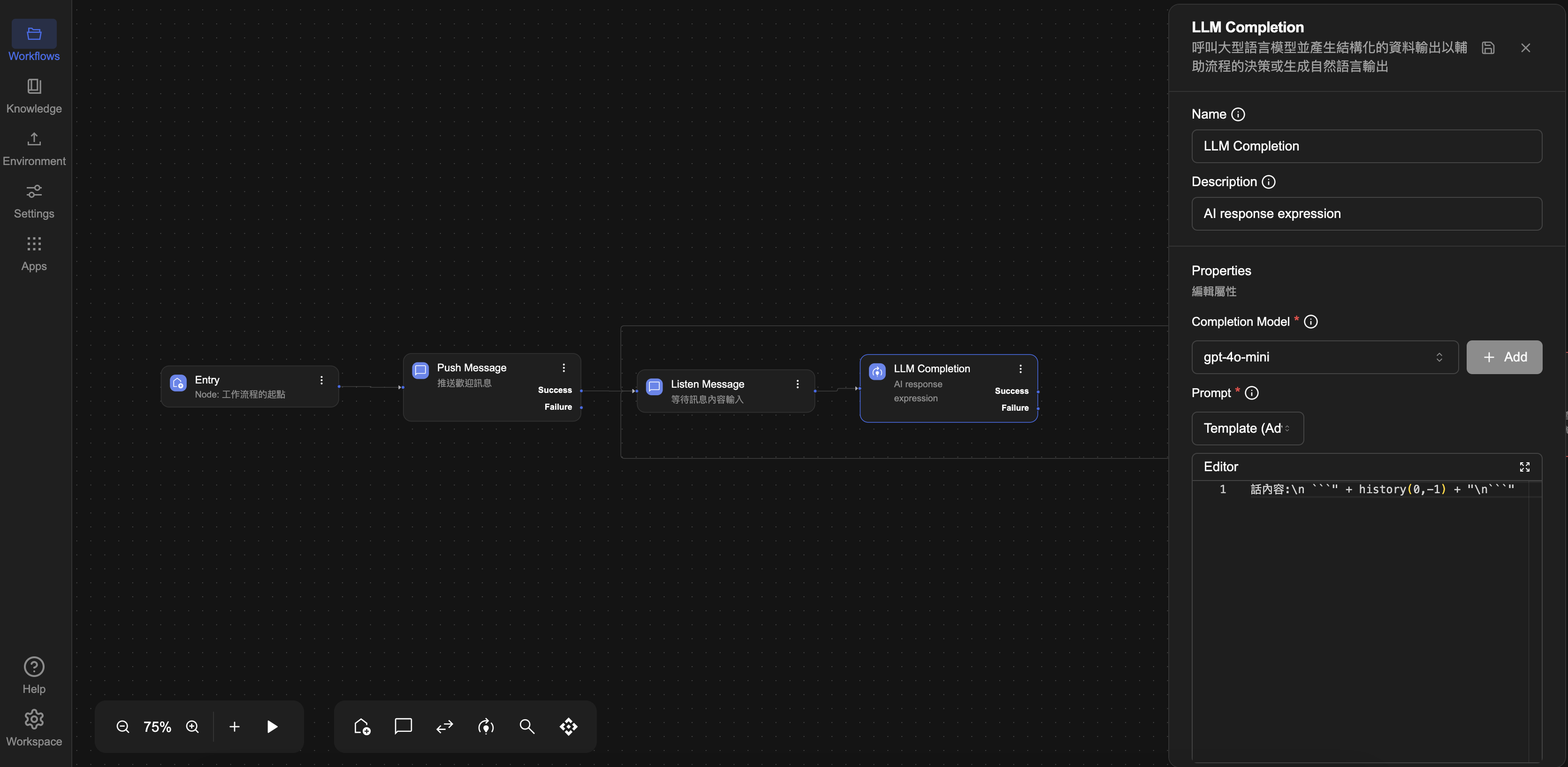 完成模型設定後,接下來點選左側選單中的 Workflow 分頁回到流程,設定 LLM Completion 節點的細節,讓 AI 能根據輸入產生回應。