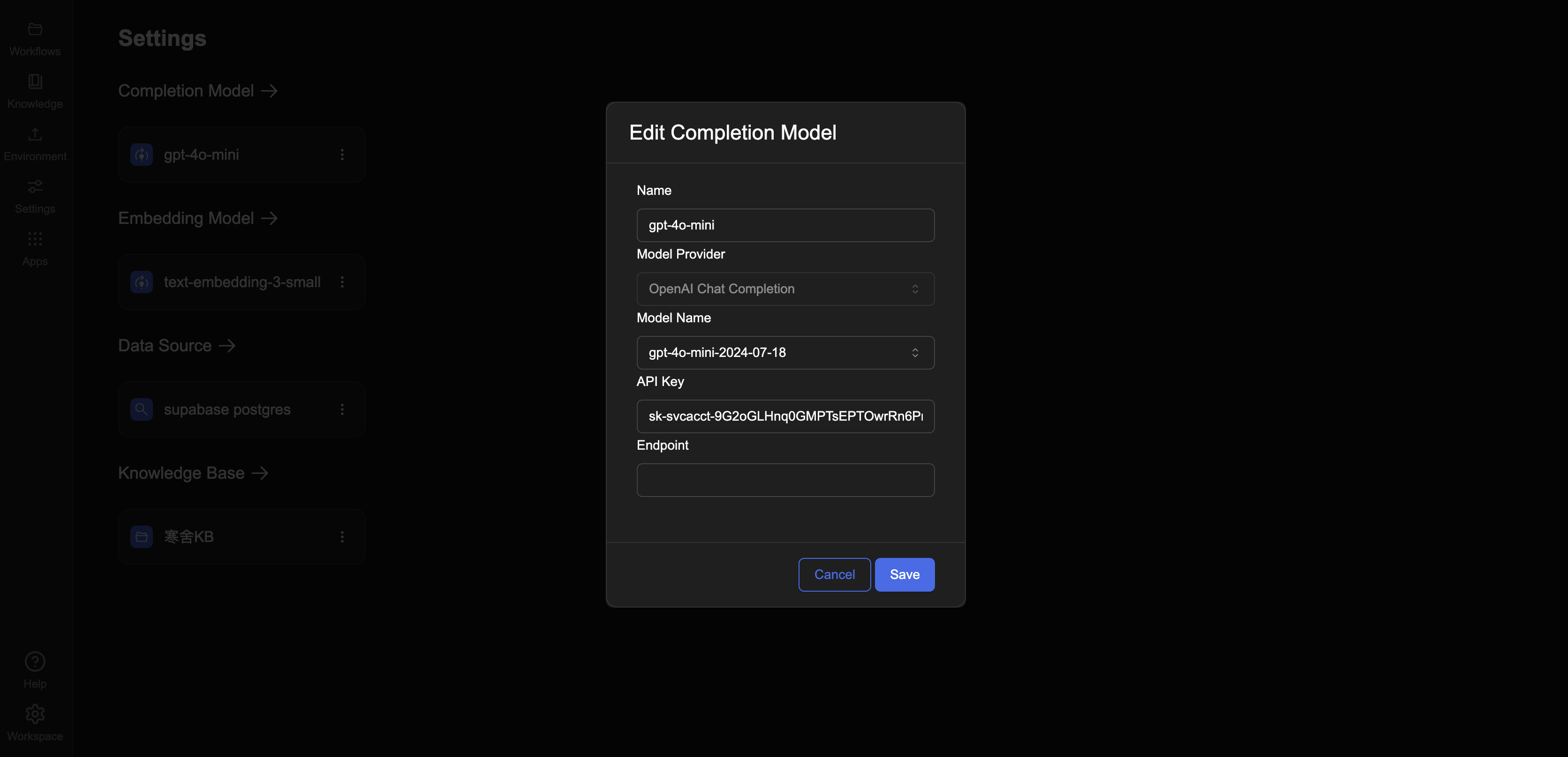 在使用 LLM Completion 節點之前,必須先完成 Completion Model(模型設定),以便系統能正確連線至大型語言模型(如 GPT-4)。