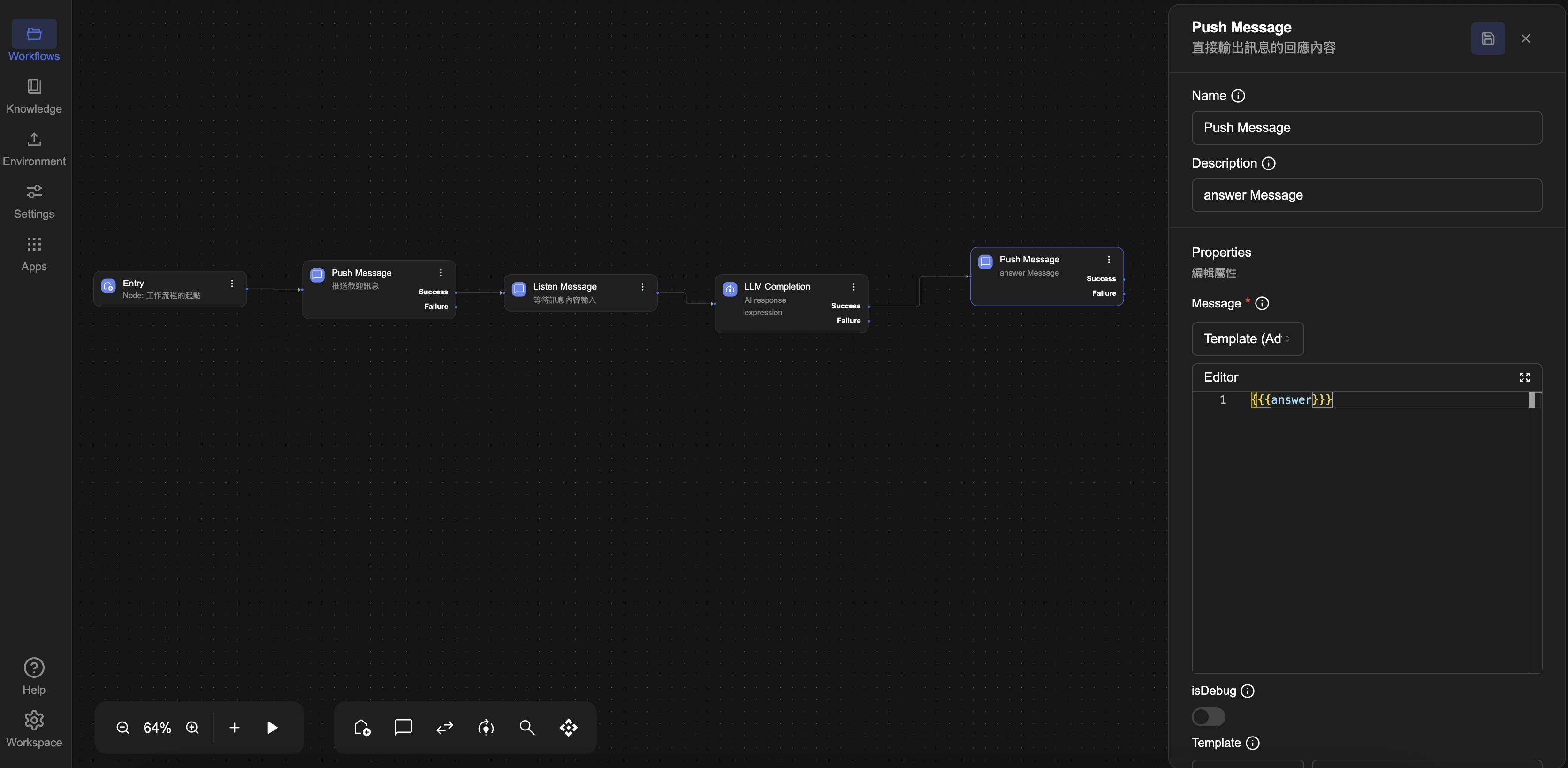 3. 節點新增後,點選 Push Message 方塊進入編輯畫面,將 Description(描述)欄位修改為:「answer Message」,以利後續辨識用途。