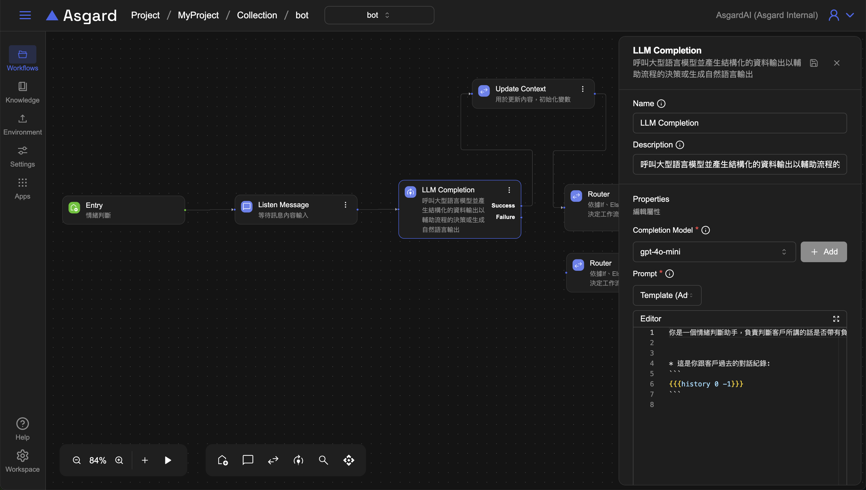 history為 Asgard 內建函數,0 是指第一則訊息,-1 是指算到上一個對話為止,因此這裡是在告訴 LLM 用戶的歷對話紀錄是從第一則到上一個對話,也就是上一步的 Listen Message 裡用戶輸入的問題。
