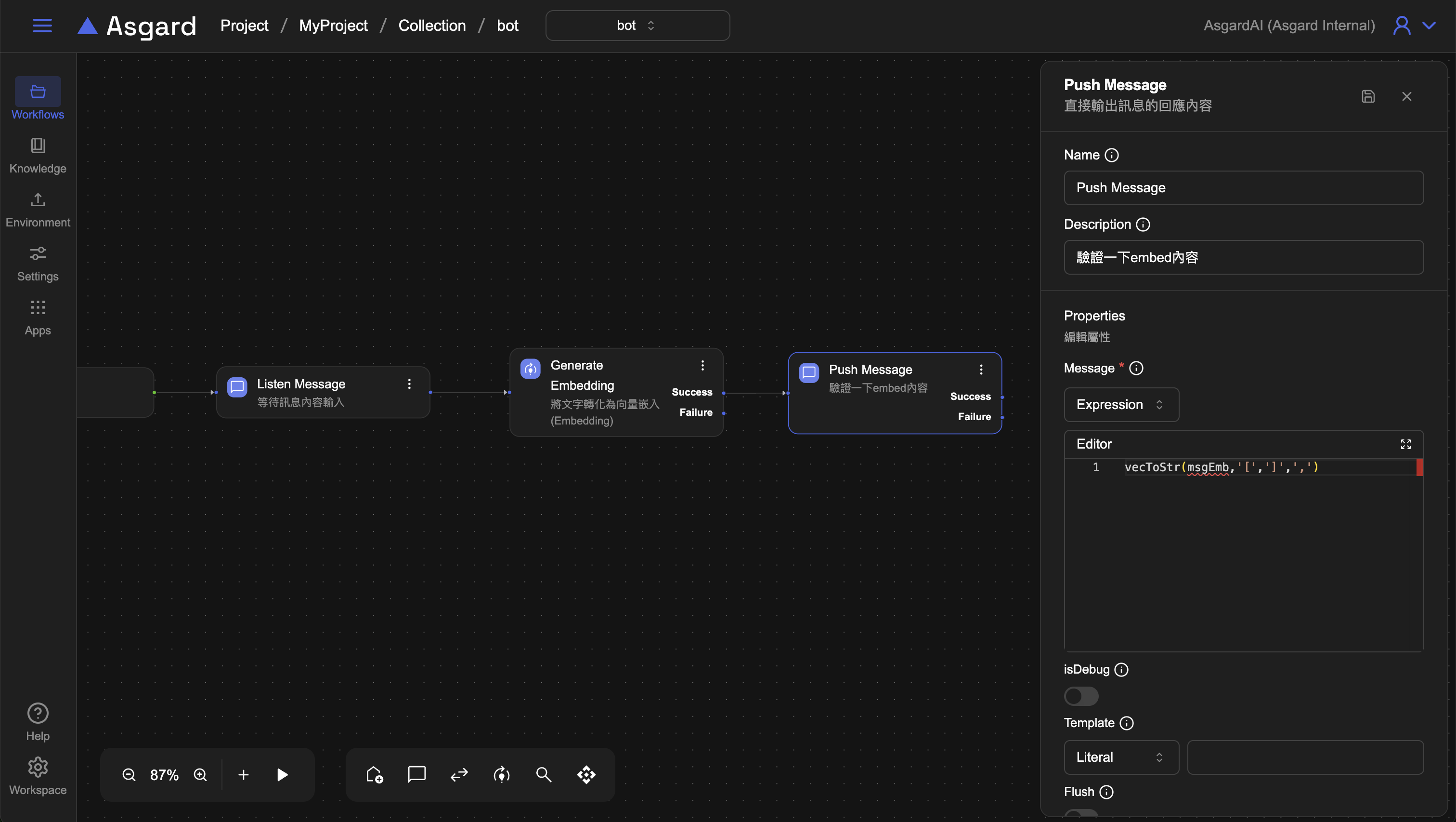 新增一個 Push Message 節點來確認轉化的內容。
