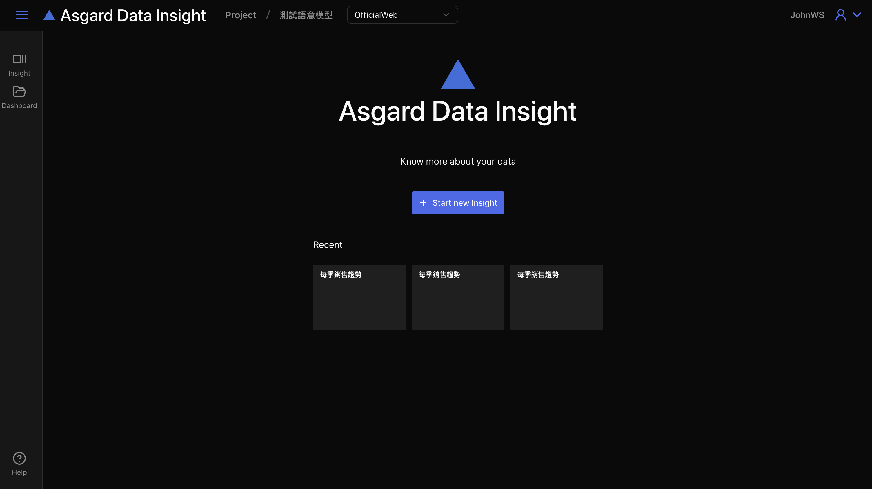 進入 Asgard Data Insight 的預設首頁會在新增一個新的 Insight (洞察),您可以直接點擊「Start new Insight」以進入。若專案有多個資料模型,可以在頂端列的模型名稱下拉選單點擊並切換不同的資料模型以繼續。