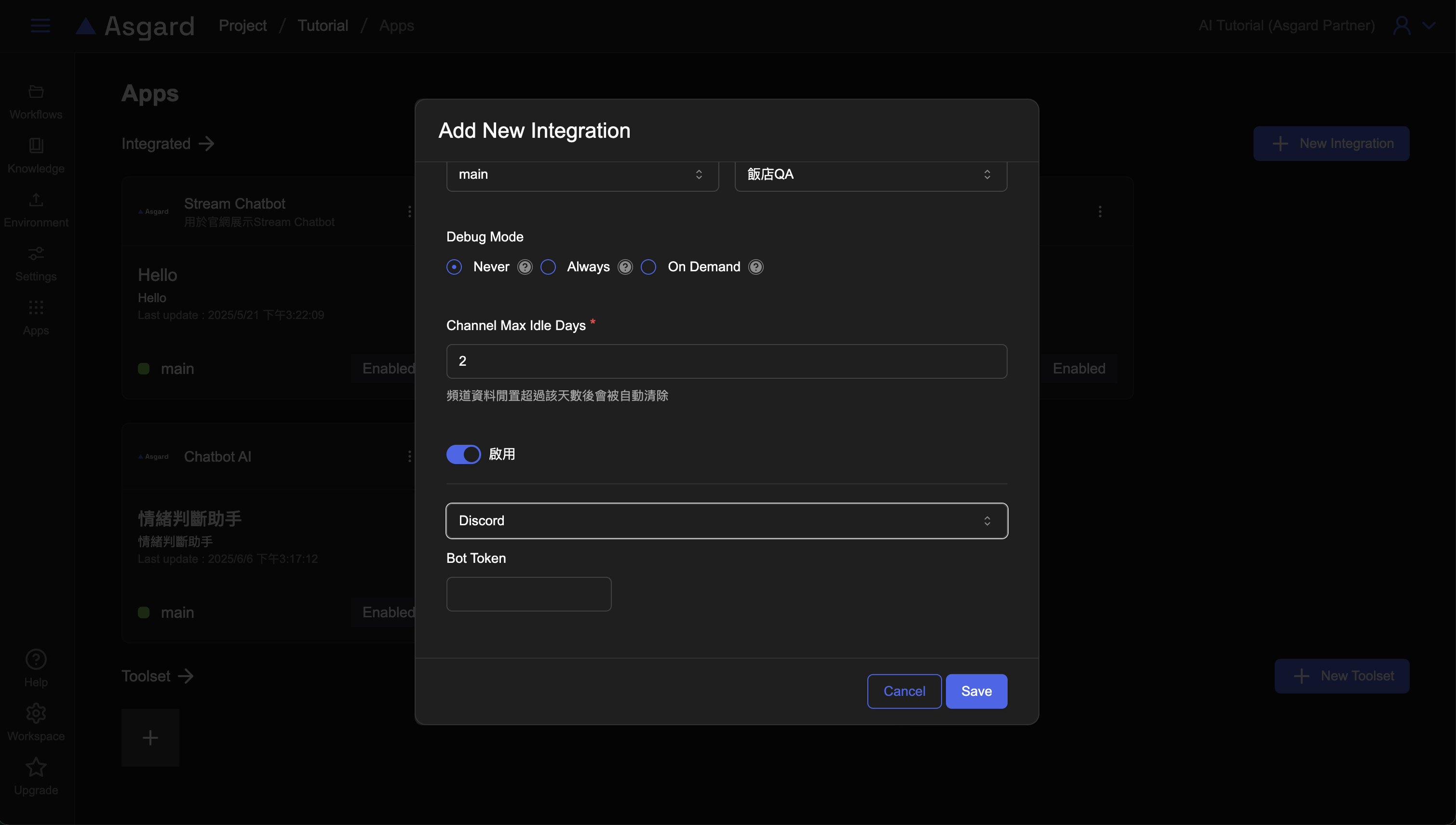 Asgard 可以快速地整合到 Discord,只要在 Asgard 填入從 Discord 取得的 Bot Token 即可。