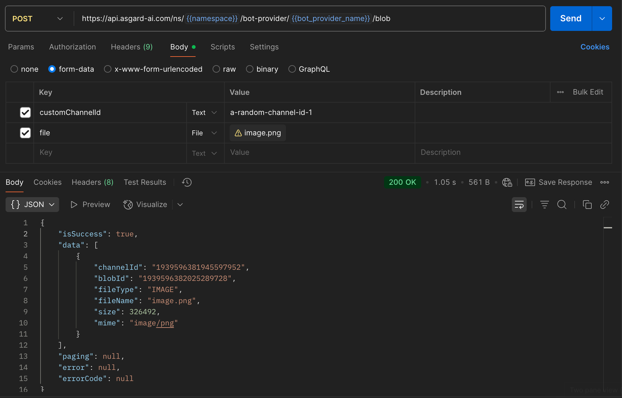 點擊 Send 即可上傳檔案。成功後會收到以下 JSON 回應: