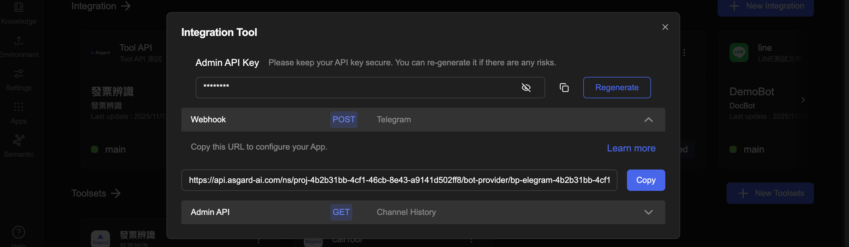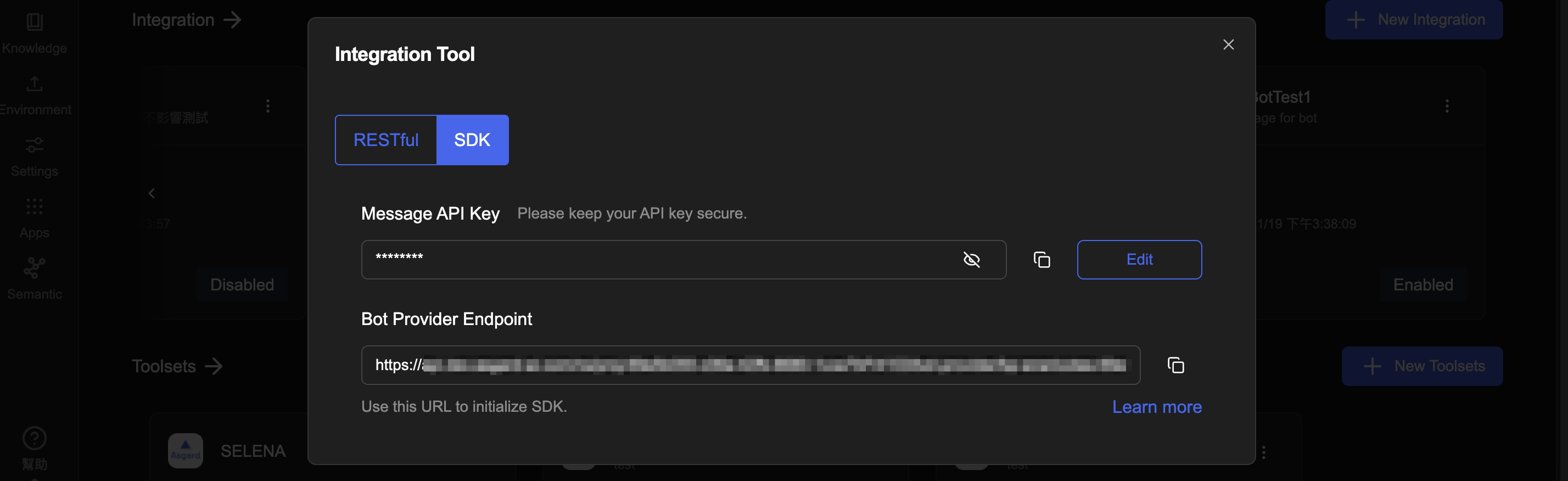 Message API KeyGeneric (Bot)呼叫 Message API 時填入。點右側複製圖示即可貼用;要換新 Key,按 Edit 回到 Integrated 編輯模式,在 Auth 設定重新儲存即可。