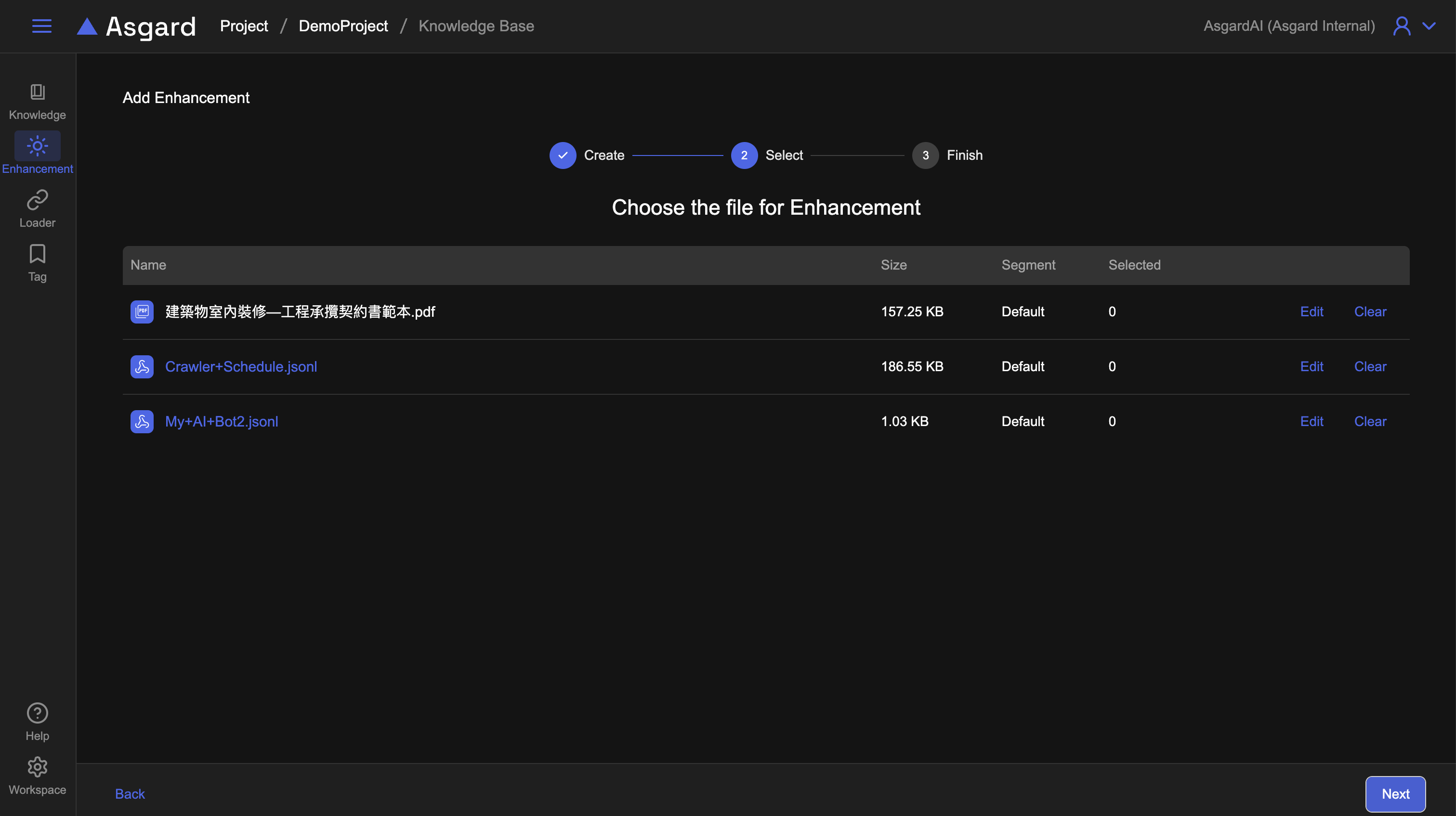 點擊右上角的「+ Add」進入新增 Enhancement 設定,此處設定與由檔案內新增相同,有三種增強類型可以選擇:補充內容(Supplement)、問題(Question)、答案(Answer)。在填寫增強時,可以上傳檔案作為補充資料(選填);可以勾選是否要將該增強加入向量搜尋。