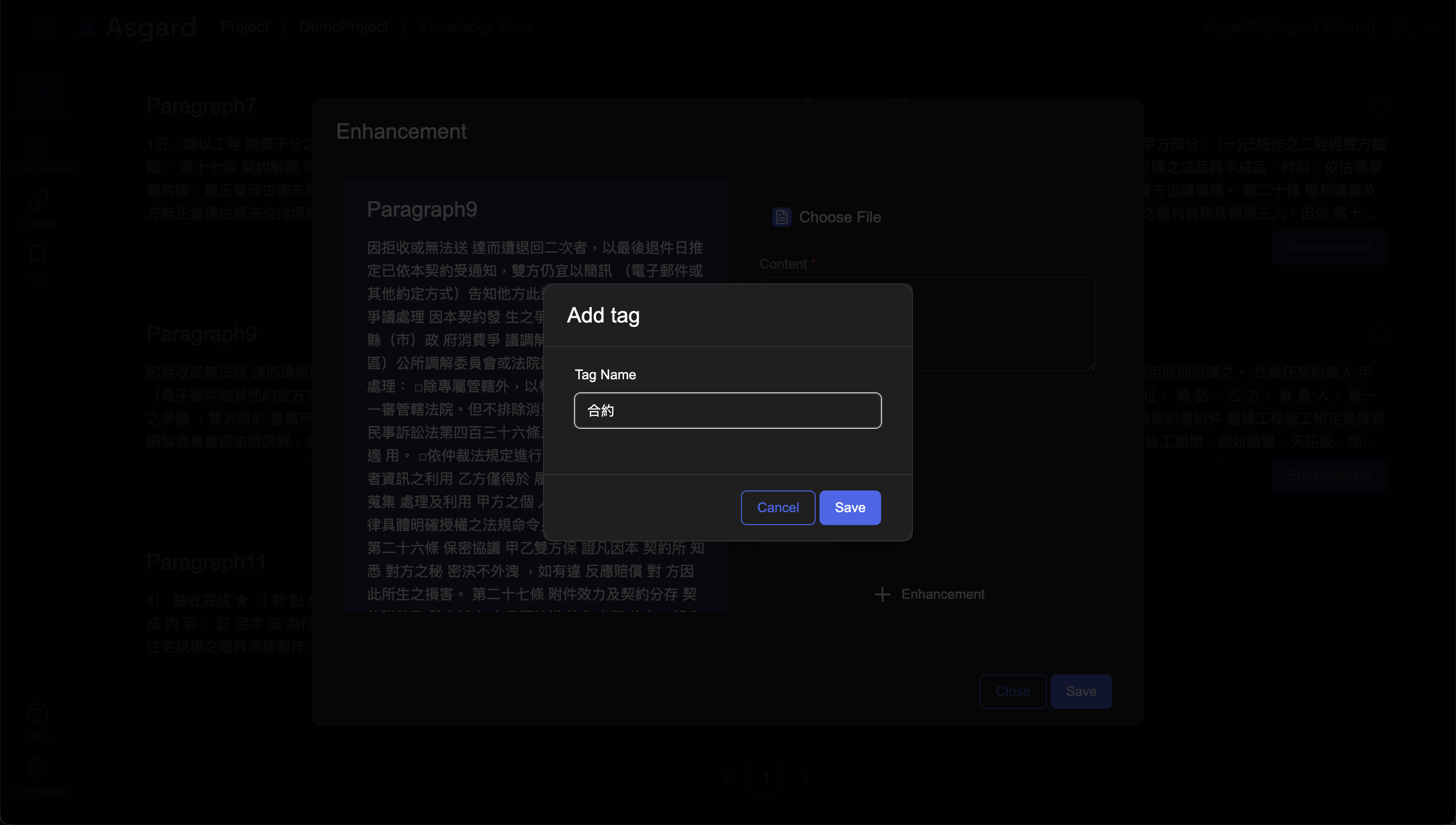 在基本的 RAG 功能之上,您可以隨心所欲地在檔案分段裡添加增強(Enhancement)以促進 AI 理解的程度。您可以在檢視檔案分段時新增 Enhancement 或是統一在 Enhancement 管理頁面新增。